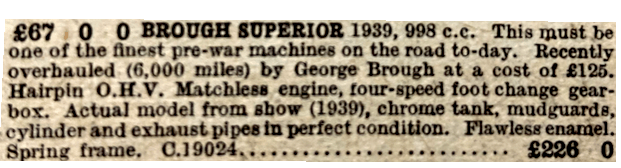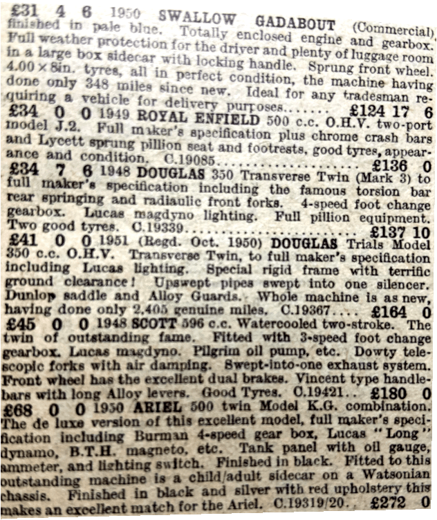 stored them for next year. While the best machines were still barely roadworthy, the show furnished a disgruntled customer with magnificent opportunities for revenge. He would haunt the neighbourhood of his maker’s stand. As soon as he saw the chief salesman in charming but mendacious conversation with an opulent contact, he would creep up, and join in the dialogue. Thus—Salesmn: ‘I assure you, sir, we can absolutely guarantee our sports model to touch 75 on the flat, and to climb Sutton Bank at 40.’ Customer (rapturously): ‘You can?’ Disgruntled One: ‘He can, heck! That’s what he said to me last year. Mine couldn’t beat 40, even when it went.’ Part of the joy of the show was to spot such a fracas, readily identifiable by the red faces and popping eyes of the protagonists, to join the small crowd around them and to keep heaping fresh fuel on the flames. Another good turn was to see the boys baiting an ignorant show attendant. Some cheeseparing factories would staff a stand with one competent salesman and a squad of tailors’ dummies recruited from the Coventry office staff—anybody who had a good lounge suit. The boys would spot one of these innocents and, assuming the rapt expression of eager novices, would put him under a quickfire technical catechism. Simultaneously, makers were absurdly prone to exhibit completely untried novelties—I have even caught them out exhibiting engines which consisted of little but an empty cylinder and a crankcase. A famous instance of this type concerned a firm which realised on the eve of the show that their customers were bound to turn nasty about the past year’s transmission (a ⅝in all-leather belt behind a really potent 500cc engine). So about a week before the show they dreamed up ‘our new patent armoured belt’. This consisted of the same old belt, adorned by a series of small rectangular steel plates riveted to the top of the belt, and hinged every inch or so. This fantastic abomination was loudly advertised as combining the feminine smoothness of the belt with the masculine sturdiness of the chain! Each hinge-pin projected outward about ¼in, and the ends registered with crescent-shaped nicks in the rims of the pulley. The firm had just five machines in the world. All were fitted with the armoured belt. Four went to the show. The head tester took the fifth down into the country to see how it behaved in practice. It had not dawned on the inventor that steel and leather do not wear equally, so that very soon the pins would no longer register with the pulley nicks, and the model would proceed to a merry jingling accompaniment. Providence, however, saved the firm from actually saddling any wretched customer with an armoured belt. Early in the test the belt fastener broke. The writhing belt ripped off half the tester’s stocking, chewed large gobbets of flesh out of his calf and, tangling itself up round the rear hub, despoked the wheel and cast the tester into a nettlesome ditch. All’s well that ends well. Within a week they found that a lin-wide belt solved their transmission problem cheaply and simply. Believe it or not, as Ripley says, too many orders may prove worse than no orders at all. One famous factory had been joggling along quietly and happily for some years on a small but steady order book. At one show they perpetrated the frightful blunder of staging a machine which won all hearts, and accepting innumerable orders, although they had only prepared for quite a small output. They booked and booked and BOOKED! The directors walked about like a £75,000 pools winner. They celebrated in champagne. Then they went home and studied production. They had neither the space, not the machines, nor the materials, nor the skilled labour for such an output. So they cheerfully decided to ‘put out’ all the simpler components to sub-contractors. This achieved, they rented bigger homes, and began buying champagne weekly by the case, instead of annually by the bottle. Alas! as the hastily assembled and hardly tested models went out to the public, the ‘phone wires fused as angry men spoke words of flame. The sub-contractors had let the firm down. Tanks were porous, or leaked at every seam. Spokes fell out of the rims and hubs. Nothing was right. I doubt if the firm ever quite regained its original reputation after that catastrophe. The famous 400cc ABC of 1919 met a somewhat similar fate, though its snag was mainly due to inflation, coupled with a premature announcement and subsequent production delays. So much for the past. Today sterling quality is as basic an assumption as the axioms of Euclid. The modern show derives its two main joys from contemplation of this quality plus meeting all the boys. For the time being, its other aspects are rather mournful. We are slightly more fortunate than the car folk, for if some motor cycle exhibits are earmarked for export, we can usually get a new post-war model without waiting very long, though the armament effect on the steel market may now prolong our delays. But the prices are formidable indeed. After the Kaiser War a brief wave of inflation hoisted prices for a few months. But the peak was shortlived. A friend of mine bought a motor cycle and sidecar in 1919 for £340, and ultimately sold the outfit for £45. Another friend paid £650 for a light car, spotted the red light three months later, and sold it just in time; a few weeks after the price had dropped to £300. But this time prices are obstinately staying up. The basic degree of inflation is round about 300%, but is raised to almost 400% by Purchase Tax. We are asked about £250 for a model which would have been listed at £70 in 1939. Many old-timers were accustomed to maintain a wife and family for twelve months on the current value of a first-class roadster! I have done as much myself. There is no sign of imminent deflation on the horizon. It is obvious that the real value of the £ cannot take a sudden upward jump, n