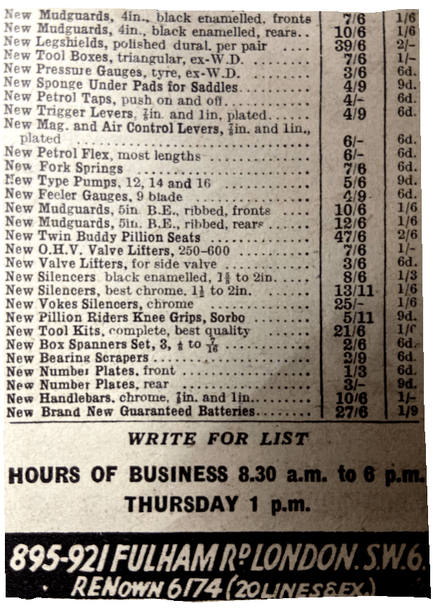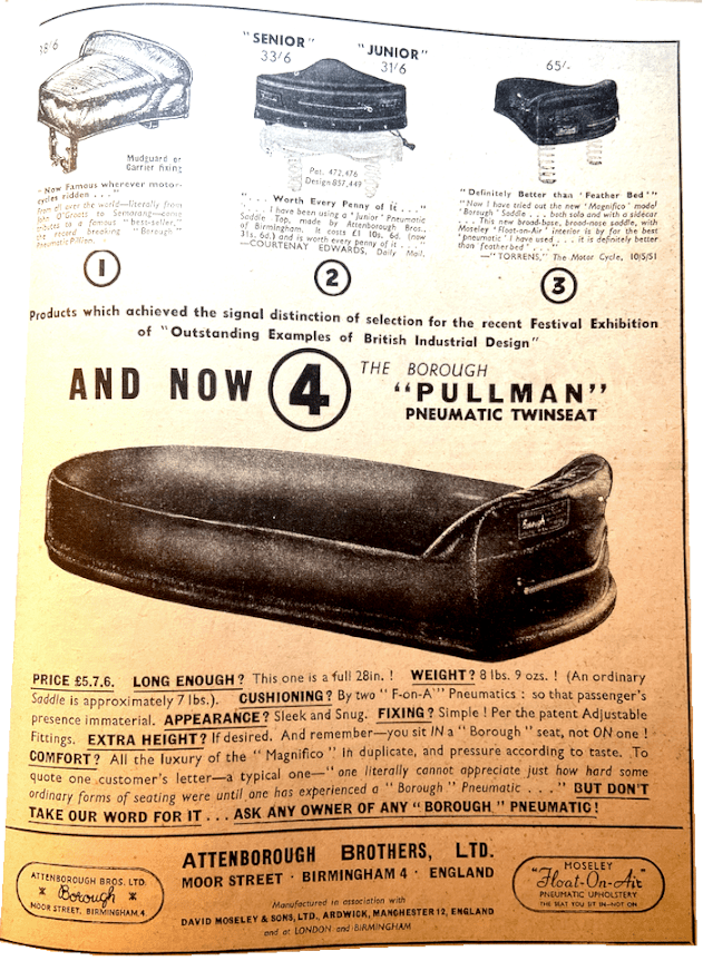 “…WHAT’S THE NAME of this handlebar screen material? Roadoid? It looks like Perspex except that it has a very slight and just perceptible bluish tint. But it makes a smart windscreen. Note how flexible it is; certainly, as our obliging HMF Stand attendant says, it ought not shatter in the event of the machine’s toppling over, nor should vibration cause it to split. At £3 14s the screen is £1 dearer than the HMF Giant Screen which is sold in such large quantities both at home and abroad. An eye-catcher is the new BSA Bantam pannier frame with integral, twin stop lights at the rear. There are no bags supplied with the frames but they are just right dimensionally to be fitted with a pair of ex-Army packs. A seething crowd appears to want to see the locking twistgrip introduced by Feridax. Enthusiasts take it in turn to sit on the rig and feel the oval-section grip. Here comes Mr Ferriday himself to explain the reason for the oval shape. It is the old trials dodge, except that instead of putting a length of ³⁄₁₆in or ⅛in rod inside a round grip to make it oval, this one is moulded in this section. There is a range of attractive riding coats—can that material really be PVC? It looks just like leather but it should be superior since PVC is impervious to oil, acid, petrol, and what have you. You might prefer the competition, collarless style, or the touring design which has an especially neat collar. You can have a coat in any colour you can think of—and the same goes for the new luxury Dualseat which is PVC covered! Plastics are indeed very much in evidence. If crash helmets ever become a la mode for motor cyclists, the 16oz Panorama plastic job on the Feridax stand looks as though it will be fairly comfortable as ‘battle bowlers’ go. The Britax stand: this is rather neat, is it not? A safety bar with tiny parking lights in each end—red facing to the rear and white to the front; and just feel the weight of it—must be 14-gauge tube at least. Fitting as it does through the top sidecar lug, installation could not be very much simpler. What? your machine has no sidecar lug? Well, no matter; a lug for clamping to the frame down tube can be supplied. Springs—helical and hairpin, tension and compression, large, medium, small and tiny—we can see them all on the Terry and Tempered Spring Co Stands. And clutch-spring cups; perhaps we can learn something of their manufacture. What? Seven operations. Well, well. Some of these spring cups are brass and some are steel because sheet-steel is in short supply.”