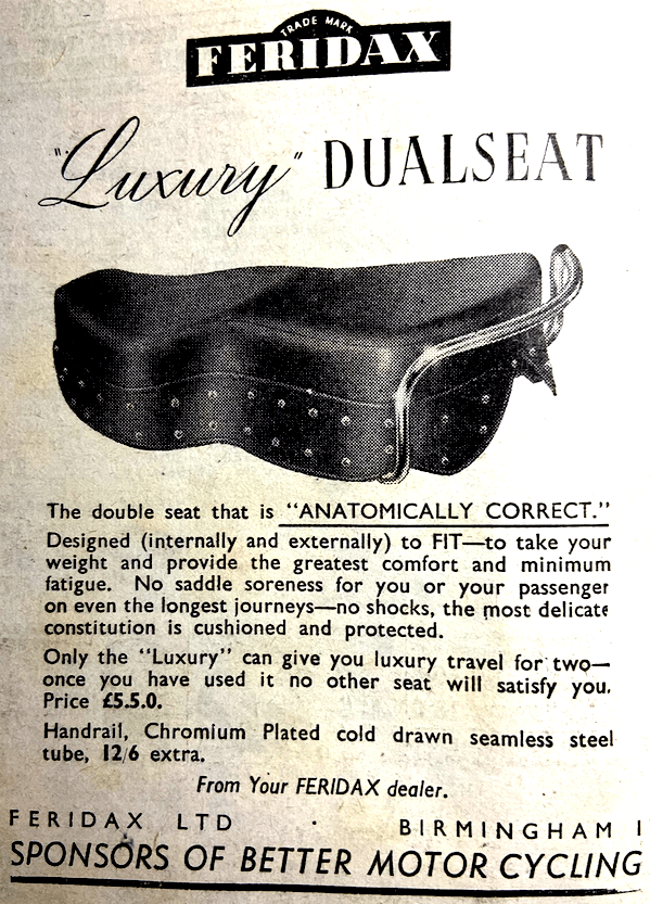 “COLLEAGUE ‘NITOR’ has tackled the question of uninsured pillion riders. Methought he handled it rather casually. If you carry an uninsured pillion rider and become involved in a crash which kills or seriously injures your companion you may be sued; and, if you are legally to blame for the accident the damages may be set at a very high figure. You are reasonably safe financially if you are a youngster on a weekly wage with no funds at your back. No lawyer would then deem you worth powder and shot. But if you have any capital, from a small business upwards, it is quite possible that a case might be brought against you, when costs and damages could easily absorb all that you possess. The only wise course is to accept no pillion passenger except a person (eg, your wife or fiancée) who is unlikely to sue you. There is, of course, a second aspect, viz, that any sensitive man would desire to be able to compensate any passenger injured through his default. In neither case is the risk one to be taken lightly, even if its incidence is not very common.”—Ixion
