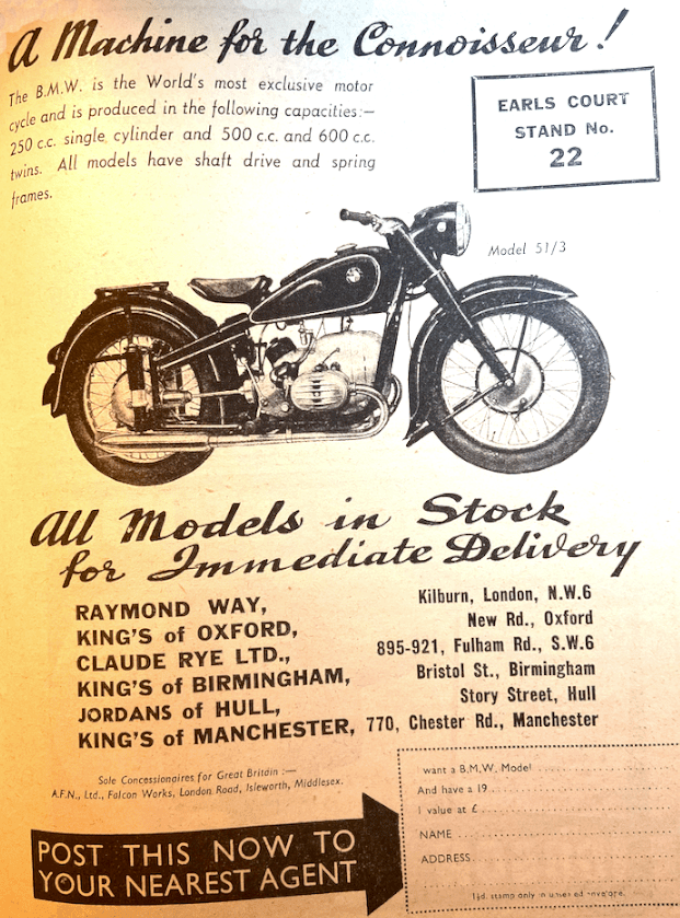 TRANSPORT MINISTER John Maclay opened the Earls Court motor cycle show. “A sea of upturned faces greeted the Minister as he spoke into the microphone on the balcony. Earlier, long queues had formed awaiting the time for the turnstiles to click at 10am…there had never been a more promising start for the London Show. Mr FA Kimberley, president of the Manufacturers’ Union, stressed that in spite of the very difficult economic period following the end of World War II, the industry had risen to the requirements of the times…in 1938, 20,000 motor cycles had been exported. In 1950 the figure was 74,000. Mr Maclay said that the industry was producing motor cycles at the rate of 180,000 a year and that 58% of that output went into foreign markets: “It is comforting to think that in all corners of the world an increasing number of people are going about their business or pleasure on such typical British products.” He referred to competition successes—the 350cc, 500cc and sidecar World’s Road Racing Championships…the Minister introduced the subject of road safety: “There is a good deal of criticism, some a irresponsible, of the motor cyclist…while there may be irresponsible elements…I think the motor cyclist is as much sinned against as sinning.” It was desirable for a learner to be instructed by an experienced motor cyclist; the Minister said he thought the RAC-ACU Training Scheme should be given every possible encouragement.”