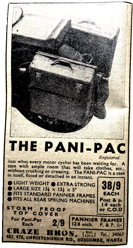 “AFTER READING VARIOUS suggestions of how to triumph over the luggage-carrying problem, I feel I must have my say. I am the owner of a 1949 346cc ohv CO Royal Enfield. The provision for attachment of pannier equipment on this machine is excellent. A matter of a few moments either attaches or detaches the equipment to the built-in fittings, and the machine looks tidy with or without luggage. Most makers seem more concerned to streamline their machines equip it to suit the tourist. to salt the ‘speed merchant’ than to equip it to suit the tourist.