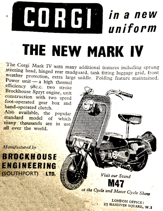 dual-seat. Main item of interest on the Corgi stand is undoubtedly the new Mark IV model. Although it is similar basically to its predecessors, there are numerous refinements giving a more comfortable and effortless ride. Most obvious improvement is the large, metal weatherscreen, which extends from nearly the top of the handlebars down to the valanced front mudguard. It then sweeps back to act as a flap to protect the rider’s feet from water and dirt. A sprung front fork is fitted, and also a foot-operated two-speed gear box. For the man (or woman) who uses the little machine purely as a runabout, the Mark II Corgi is still available; it is basically unaltered. The 98cc Cyc-Auto is unique in its class
