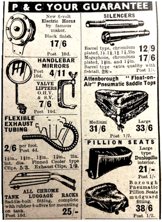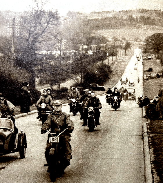 “RECENT CORRESPONDENCE prompts me to remark that in my experience modern machines show no improvement over those produced two or three decades ago, the main reason, no doubt, being concerned with weight. I have in mind a 292cc Alldays-Allon two-speed, belt-drive, two-stroke, circa 1920; a 348cc side-valve Raleigh with outside flywheel, 1923; a 250cc twin ohv Panthette with four speeds; followed by a James 498cc side-valve V-twin (1928), ridden solo and sidecar; then a BSA 770cc V-twin side-valve, 1930; and a 1934 BSA V-twin ohv, with sidecar. Practically all the riding was done with my wife as pillion passenger. In attempts from time to time on many of the better-known trials hills, during holidays and week-ends, a passenger never seemed to be a handicap. The Allon was not much good on hills until the gear box was changed for a three-speed, and then it would tackle Kirkstone Pass from Ambleside without a falter. In Wales it kept going on a hill where the old ‘T’ model Ford cars conked out. The Raleigh climbed Mill Lane, near Cheltenham, still used in trials, two-up; and, of course, West Country hills like Porlock and Lynton (the surfaces were quite different from to-day). The James 498cc twin could not be stopped anywhere, even with sidecar. A Scottish Six Days’ hill at Drumnadrochit, climbing corkscrew fashion through a wood, did not stop the James, ridden without sidecar two-up. The little 250cc Panthette would tear up. Porlock on second gear with a 10-stone passenger; and also up Doverhay on first gear. With some club friends we paid a visit to Alms Hill, near Henley (now closed). The Panthette toured up this steep hill with wife on pillion. Again referring to Doverhay, some 20 years ago I watched a lady driver with her girl friend in the chair take an Ariel 500cc sidecar up this one-in-four affair standing on the saddle; the lady in question was obviously not unacquainted with trials. All the above seems to show that standard modern machines have nothing on the old ‘uns when it comes to dealing with steep stuff. I have not done any serious riding for several years, and I should just hate to ride any of the modern 4cwt stuff up Doverhay in cold blood, but no doubt anno domini has a lot to do with this. Happy days. By the way, how many visitors to Porlock know that there are five different routes from the village emerging to the main Lynmouth road further on, all being rideable. Incidental to the subject of hill-climbing, I have always favoured lever carburettor controls instead of twist grips when it is a question of crafty methods on tricky gradients.
