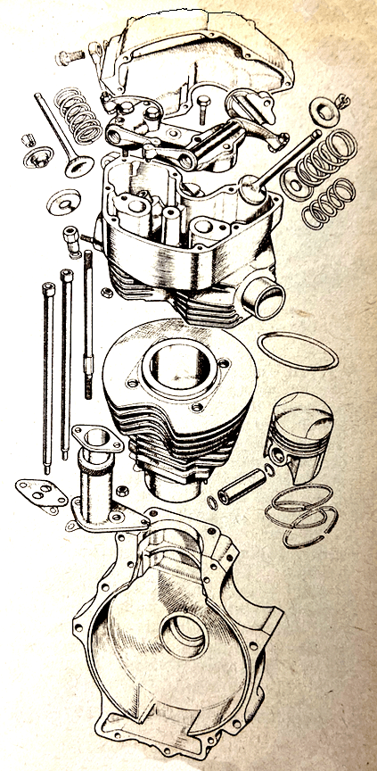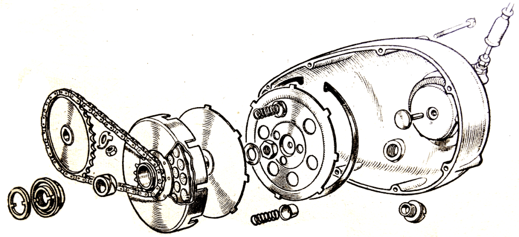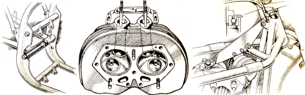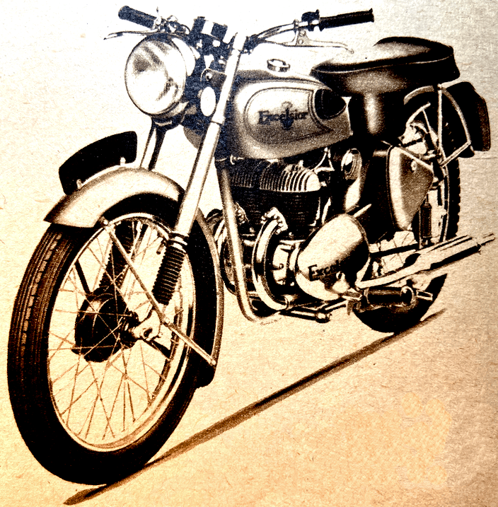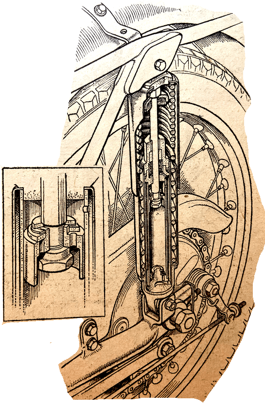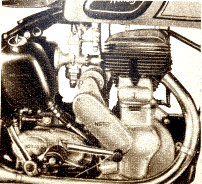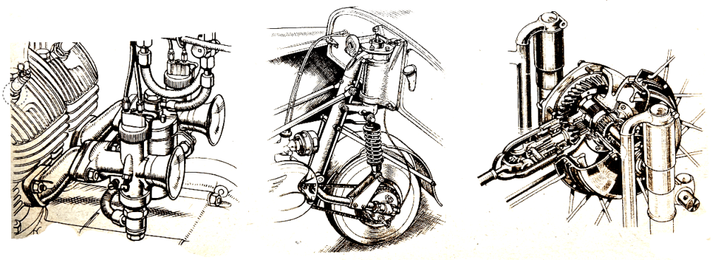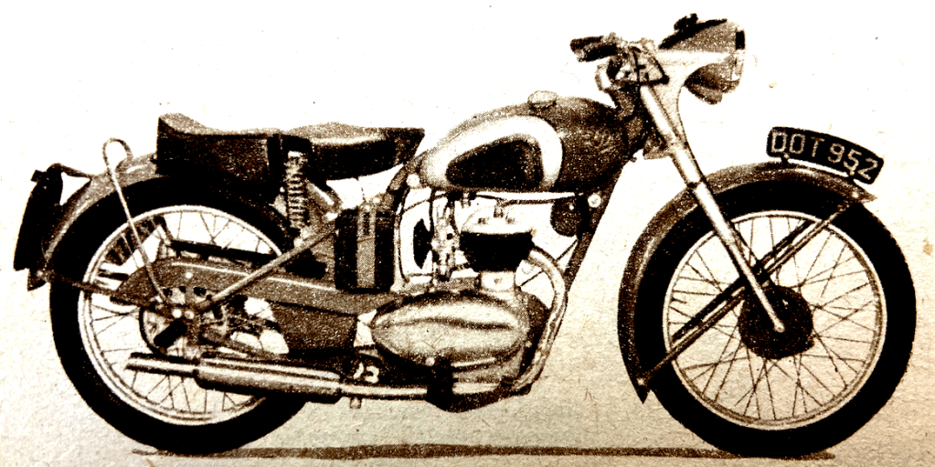 double-single. The latter variant, which has had considerable success abroad, has the great advantage of providing much better port timing with a consequent improvement in performance and fuel economy. On the other hand, it adds to both weight and cost. The bulk of the British two-stroke engine market is supplied by one firm whose experience is unrivalled. I do not know which model to admire most, but I am intrigued to see that the 197s are appearing in competitions with no little success. I must add a word of praise for the performance of those tiny engines which propel cycles with such verve. The two-stroke appears to shine particularly brightly in this galaxy. Some considerable attention has been paid to gear boxes, and shafts tend to become shorter and more rigid. This is all to the good since there is likely to be less whip, and consequently less noise and loss of power. Foot-change mechanism also has been improved in detail. It seems odd to find that there are still many folk who prefer hand change when foot operation appears to have so many advantages. There is not much to be said about transmission since there no marked change in this line. Chains can be very efficient if correctly maintained and properly protected; yet I doubt if owners of the two existing British shaft-driven machines would revert to chain drive if they could possibly avoid it. Shaft drive may add slightly to the initial cost, but the complete absence of mess and maintenance is a very real joy. New Continental models show a marked trend toward total chain enclosure and if chain drive is to survive this country may find it necessary to follow suit. Now that the flexible suspension of both ends of the machine is almost universal, a great deal of thought and ingenuity is being expended on this subject. Not every manufacturer who changed over to telescopic front forks made a perfect job of it at the first attempt, and whether the suspension system be dependent on springs, air, oil, rubber or a combination of more than one of these media, it is important to remember that to obtain the best results front and rear suspension characteristics most be considered together. Many telescopic front forks are hydraulically damped and many and various are the degrees of hydraulic damping. In some systems only the rebound is damped; in others, both load and recoil are progressively checked…As to rear suspension, the trend appears to be toward pivoted rear forks. Plunger springing has confounded its critics, and in many instances provides a first-class ride, but there is a slight swing towards pivoted forks which I am inclined to think will increase. Whichever type becomes the more popular, there will always be fluctuations in chain tension. However, these fluctuations can be minimised by keeping the sprockets (driving and driven) as nearly equal in diameter as circumstances
