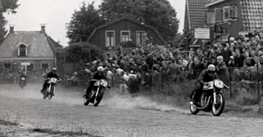 “FROM THE YARD at the back of the hotel a voice floats up to my window, ‘I luv you, ducks. Do you know what that means?’ The blonde girl ceases beating her mat for a moment and now come a few sentences of Dutch. What she says I shall never know. But the English voice with more than a hint of Lancashire continues, and as I lean out of the window I see the man’s expressive gestures as he adds, ‘We’ll walk arm in arm down the road—like this, see?’ It is all innocent fun: the typical Englishman’s love of a joke. For the man—the cheeky chappie in foreign parts—is a member of the Continental Circus, and certainly has no time to take the girl for a walk through the gloaming. It is the morning of the Dutch TT, and next day he will be travelling southwards, making the long trek by lorry down to the South of France and Albi. The Anglo-Dutch banter continues and I move away from the window. I too must be on the way—down to the hotel’s front steps and along the streets of Assen. It is about nine o’clock—a golden morning—and already the traffic is passing through the town along towards the course. I stand beneath the shadow of the tall, handsome church by the cross-roads and watch for a few moments. The cyclists float by in their hundreds; the motor cyclists, mostly on solos, with silencers singularly innocent of internals, come through steadily; the cars bounce past on the uneven paving. I have seen similar streams of motor cycles and cars in England; I have not seen such streams of cyclists. Think of a large number of cyclists. Then think of an impossible fantasia of cyclists and you are somewhere near imagining the scene. These cyclists don’t ride along; they float along pair by pair as though born on two wheels. A fair number of