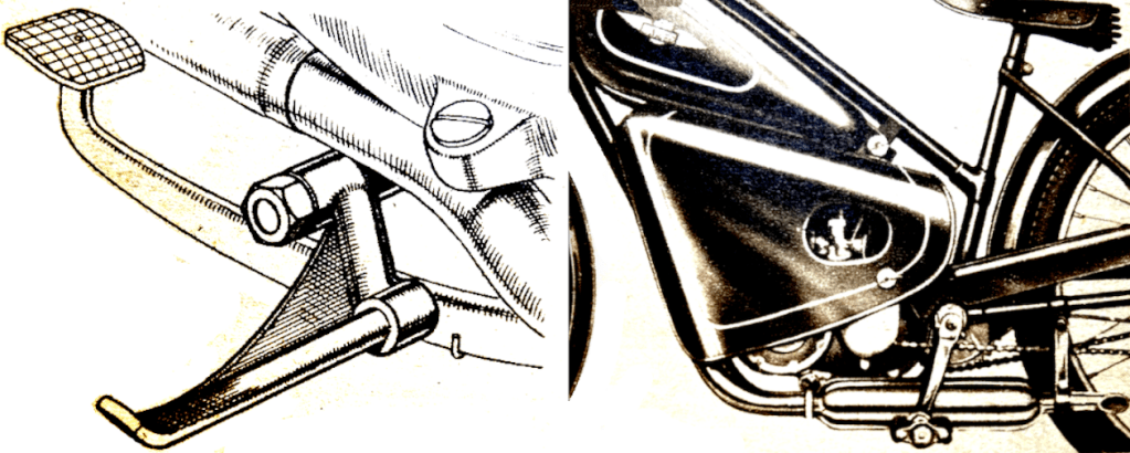 20mph on the speedometer the engine appeared to be running well within its limits. At speeds much in excess of this the exhaust note tended to be on the ‘hearty’ side and the engine would start to ‘fuss’. Fairly long runs did not affect the tune of the engine at all; at one time the machine was cruised for 10 miles at about 20mph, and at the end of this trip, although the barrel was very hot, there were no signs of fading. Hill-climbing capabilities, while not outstanding, were quite good, provided a run with the engine turning over rapidly could be made. One hill, which causes most cyclists to select their lowest gear, was tackled by the Itom at just over 10mph with no assistance from the rider. Mention must be made of the spring fork supplied with the machine. The effects of all minor corrugations in the road surface, such as cobbles and small depressions, were eliminated most satisfactorily and the fork proved to be of great benefit for town riding. Anything in the nature of a pot-hole would cause the fork to bottom, but even in such a case there was not the violent shock that one associates with a solid front fork. Another benefit derived from this fork was improved braking. Both brakes could be jammed on as hard as possible, yet there was no trace of deviation from line or any other indication of instability. In the initial stages a close watch on the friction-type shock-absorbers was desirable, for after about 50 miles they tended to bed down to some extent, and then the fork would clash readily. It was, however, the work of a minute to tighten these adjusters to the correct extent. A potential source of worry to owners of foreign machines is the supply of spares. In the case of the Itom it is stated by George Grose that ample stocks of replacements are available.”