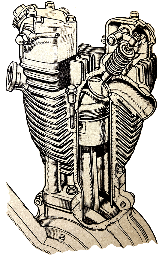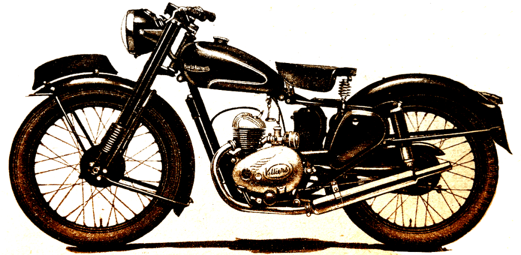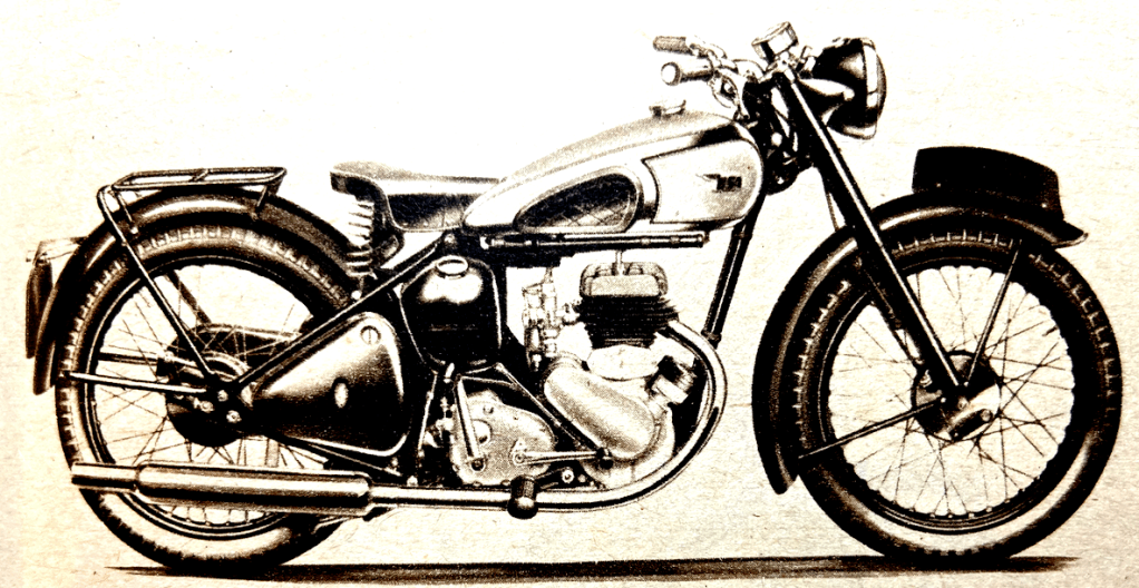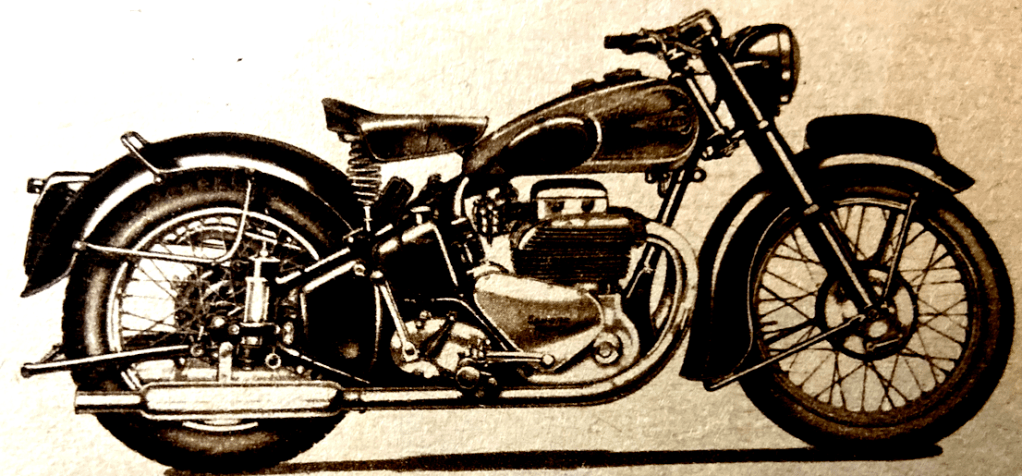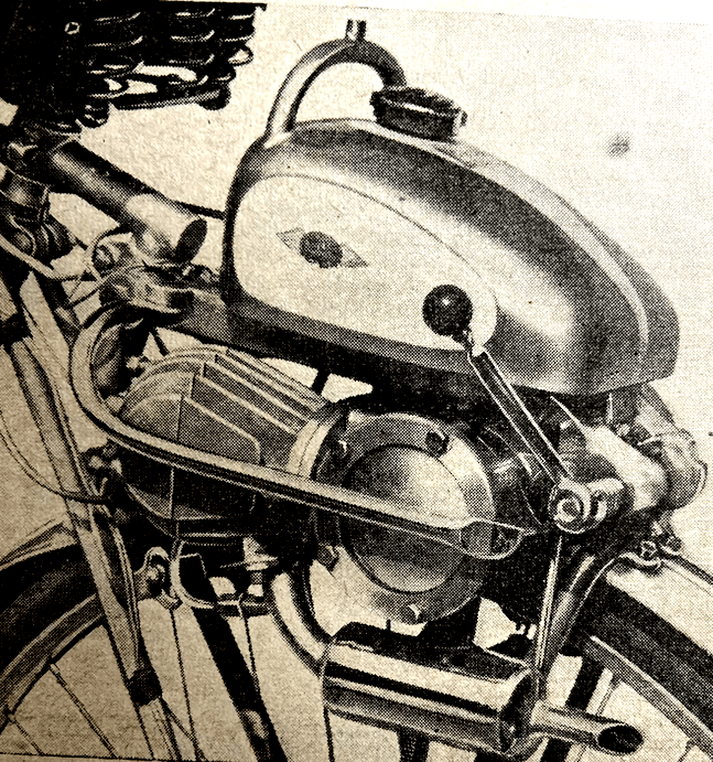 present examples. Before leaving the subject of parallel-twins, some mention must be made of the side-valve example which is on show but not, alas, on sale. It is well known that the Ministry of Supply has always favoured the side-valve, and this is the raison d’etre of the present exhibit. Nevertheless, there are many other folk who have a weakness for side-valve gear, and there might well be room for such a model on the market. There have been spasmodic examples of side-valve parallel-twins from other quarters but they do not seem to have materialised. Of other twins, there is a superb example of what can be done with the V-type in the largest class, and there are two British makes of flat-twin. These two, with a geared-crank four-cylinder unit, are the only British examples of engines with intrinsically well-balanced layouts. The single remains ever-popular, and will continue to do so for some time: It has, in the case of our best-known racing stable, justified its existence in no uncertain manner during the past year. Yet, from the tourist’s point of view, and also that of the technician, its strongest claim to continuance lies solely in the fact that it costs less than a twin. That, unfortunately, is a matter of prime importance just now….Side-valves do not appear to be on the increase. Some famous, indeed almost legendary, side-valve models remain in up-to-date dressing for the excellent reason that nothing better suited to their particular sphere of activity has yet been devised. This statement applies mainly, but not entirely, to big singles which are ever popular for passenger work. It seems odd that the 250cc engine has declined so much in popularity in this country, and I sometimes puzzle over a satisfactory reason. Perhaps the modern 150-200cc two-stroke, with its lighter weight, low cost and good all-round performance, has cut into the market to a considerable degree. The fact remains that there are only four British makes of 250cc single and one two-stroke twin of this capacity at present on the British market. This brings us to the subject of the two-strokes, which have made such tremendous advances in popularity in the past decade. No one has yet eliminated the bug-bear of four-stroking at small throttle openings, though some types are better than others. For those who are prepared to put up with this mechanically unimportant drawback, the two-stroke, with its utter simplicity, light weight and admirable slogging capabilities, is a very sound proposition. Though not yet so popular in this country as on the Continent, it has a very large following which is likely to increase. Continental manufacturers have a habit of making their engine and gear units look extremely attractive by the careful enclosure of various parts. A smooth exterior is a great attraction especially to those who like to maintain their machines in clean condition. So far only one British manufacturer has followed suit, but I should not be surprised if others fall into line before long. Maximum cylinder capacity for modern two-strokes remains at under 200cc and, of course, taxation in various countries has had a considerable bearing on this matter. There are only two British twin two-strokes and, at the moment, no British