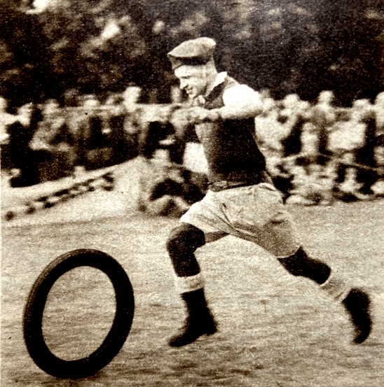 Drenthe, you are lying on the grass, one of many thousands, seeing this international struggle. Looking at the leaders on the scoreboard, the numbers would have this significance: Lap 1, Anderson, Duke. Ruffo, Pagani; Lap 2, Duke, Anderson. Pagani, Masetti; Lap 3, Duke, Masetti, Pagani, Anderson; Lap 4, Duke, Masetti, Pagani, Anderson; Lap 5, Masetti, Pagani, Duke, Anderson; Lap 6, Duke, Pagani, Masetti, Anderson; Lap 7, Masetti, Duke, Pagani, Anderson; Lap 8, Duke, Pagani, Masetti, Anderson; Lap 9, Duke, Pagani, Masetti, Anderson; Lap 9, Duke, Pagani, Masetti, Anderson. After that, this wonderful line-ahead racing breaks up; but the nine-lap tussle along the shadowed lanes of the Netherlands has been worth coming many miles to see. And as Duke finally flashes over the finishing line the crowds rise to their feet and raise a mighty cheer. That evening the cyclists and motor cyclists ride into Assen in their thousands. The town is en fête. The milling crowds pass beneath the coloured lights and lanterns strung along the streets. Even the police-station is floodlit (just imagine Brixton police-station being flood-lit for the Grand Prix of Clapham!). There is a fair with roundabouts and swings in the square, and itinerant fiddlers and singers have come into the town to entertain and pass round the hat. Youth is intent on enjoying itself, and the more solid old burghers stand with smiles on their faces watching with a certain pride and admiration the younger generation. This junketing takes place on the night before the race and the night after. The first night is the noisier. But on the second night the evening is rounded off with a fireworks display. Rockets rise into the mellow sky of evening and send out their golden showers of rain; and the crowd, enraptured, gaze upwards and know that one more race-day has ended.”—Cambrian