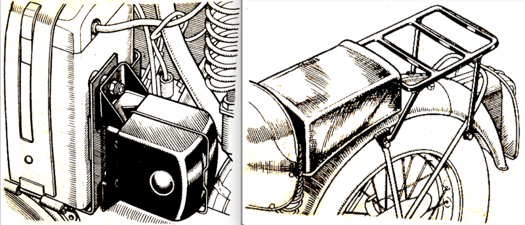 “WRITING FROM CAPE TOWN, AJ Bezuidenhout suggests that the LE Velocette lends itself particularly well to luggage carrying. His modifications to this end were undertaken for an extended tour of the Union. He had envisaged using a suitcase on the pillion, the standard panniers, and a rucksack on his back. However, he fabricated a set of carriers from light rod and heavy-gauge wire mesh, and was able to employ three Army packs and a Gladstone bag as well as the panniers, leaving nothing to be carried on his back, which greatly increased his riding comfort. The tank and pillion are equipped with heavy wire grids with retaining ‘ears’ and the pillion footboards form the bases for baskets in which the supplementary Army pack panniers are retained. The cage is fastened to the pillion platform with four bolts, holding through the platform and through metal straps above the wire mesh. Side-carrier frames are open box-frames of spot-welded construction. Tabs spot-welded down members take the bolts to the machine’s frame.”