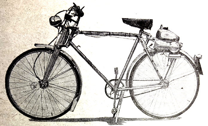“PERHAPS THE FIRST impression conveyed by the Italian-made Itom Cyclemotor is one of elegance. The particular engine tested was fixed to a Norman sports cycle of roughly the same colour scheme of blue-green with cream panels, and it was generally agreed that it was one of the smartest cyclemotors ever to grace the Dorset House car park. A number of points about the Itom show that the designers have not spared any efforts to supply an engine that will appeal to the discerning rider. For example, the compression-release valve has a small pipe fixed to it so that blowback is led into the silencer; there is a neat chromium-plated safety-bar round the left side of the engine to protect the light-alloy cylinder barrel in the event of a fall, and an ingenious quick-release plastic cover is fitted to the plug. To remove this cover it is only necessary to give a slight tug on the ht lead. Starting the horn was simple provided the Dellorto carburettor was copiously flooded by means of the pump on the float chamber, and provided the air lever was closed. Then, with the throttle lever about one-third open, it was possible to achieve a start in about 10 feet of pedalling. After a quarter of a mile had been covered the air lever could be opened and ignored until the next cold start. Two-stroking was erratic until about 7mph was reached, when the motor two-stroked perfectly until nearly full throttle. Although the engine would pull the cycle at speeds below 7mph, it was not possible to accelerate away readily unless assistance was given from the pedals to bring up the revs. Above 7mph the engine would respond to the throttle briskly and was so lively that first experience in thick traffic prompted caution to avoid catching up with the next vehicle too quickly. For very low speeds it was found that the best way to keep the machine under way was to pedal with the compression release open and, when circumstances permitted, to release the valve and use the engine. When the engine was hot, starting was simplicity itself. It was necessary to pedal only a very short distance with the decompressor raised, and with the throttle just off the fully closed position the motor would start with very little effort immediately the decompression control was released. After about 50 miles had been covered the Italian sparking plug failed completely and a Lodge H14 was substituted. This plug improved the starting and also resulted in a smoother-running engine. The Itom excelled in fairly fast running on level roads, and was quite capable of holding its own with average slower-moving traffic. With