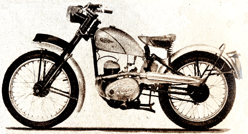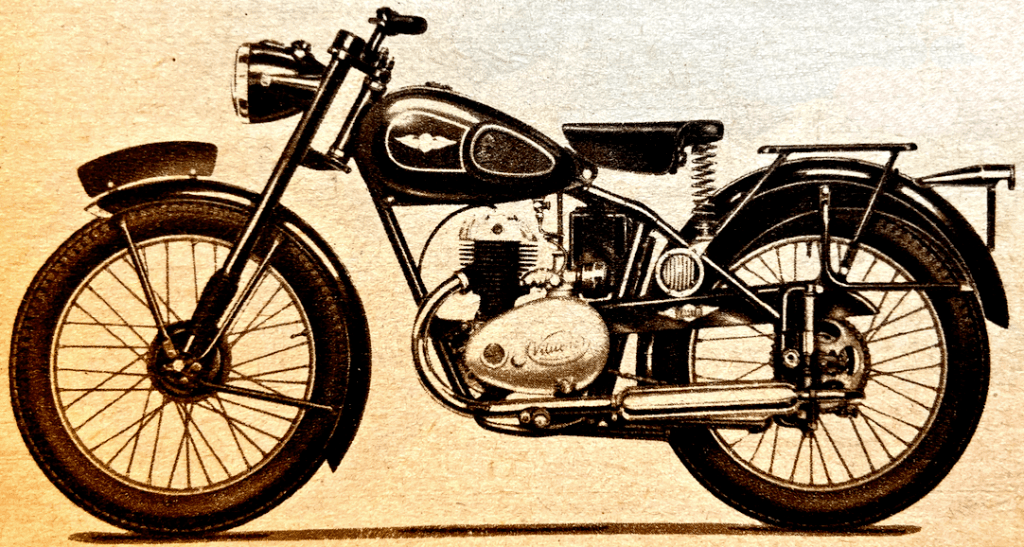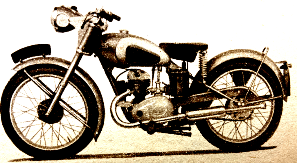 Six Days’ Trial. The engine has overhead valves operated by pull-rods. Engine and three-speed gear box are in unit. As one expects with Italian machines, the finish is in flaming red enamel and chromium plating. Perhaps the most out-standing feature of the design is the absence of a front down tube—the frame is a simple cantilever ‘back-bone’ construction. Favourable comment among lightweight enthusiasts is aroused by the neat and effective pivoting-fork rear suspension with hand-adjustable friction dampers. There is a movement of about 2in on the suspension. Unusual to British eyes is the heel-and-toe gear-change lever on the right-hand side. The advantage of this type of lever is that the rider’s boot or shoe is not blemished in any way when changing gear. Tucked away under the headlamp is a small alternating-current horn working directly from the flywheel generator. Among the riders’ points are the provision of a neat aluminium-alloy cover over the gear box, and the easily operated centre stand. With its gleaming beige and chromium colour scheme, twin Amal carburettors, and its touring-cum-racing dual-seat, there is little wonder that the sports edition of the Excelsior Talisman Twin forms one of the main centres of interest. It is shown in company with eight other models: two autocycles, two 125s and 197s, one standard