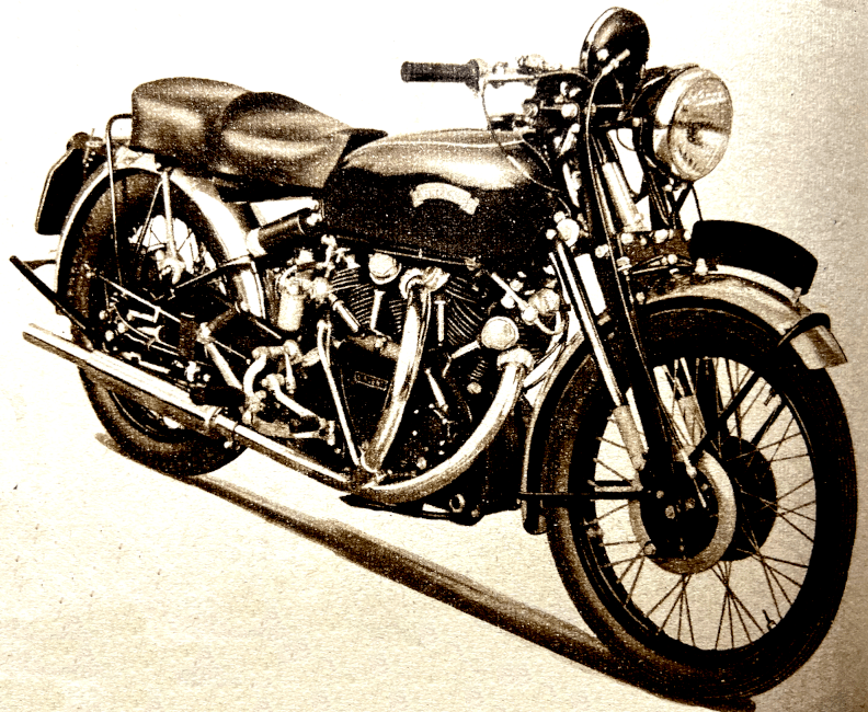 on Stand 76 are attracting the interest of many enthusiasts and prospective riders. The unique Model LE appears for the first time at Earls Court in its larger (192cc) capacity and, by virtue of the increased reserve of power for hill-climbing and pillion riding, now extends its appeal still more widely. For luxury, utilitarian transport, it continues to set an unsurpassed standard. Silence, comfort, cleanliness, economy, and an absolute minimum of maintenance are outstanding features of this conception. Many are trying the armchair riding position and noting the ample mudguarding and legshields—the latter incorporating instrument panels at their upper ends—and the almost absurdly easy-to-operate centre stand. For the technically interested, the beautifully sectioned units show the inner details of the water-cooled, horizontally opposed, twin-cylinder, side-valve engine in unit with its three-speed gear box. The shaft-drive is neatly enclosed in the rear pivoting fork, while the combined 30-watt generator and ignition unit is mounted at the front of the engine. More orthodox in layout is the latest version of the popular 350cc ohv MAC. The engine of this model has been largely redesigned and now boasts an Al-Fin cylinder barrel and an aluminium-alloy cylinder head. This latter casting also houses the completely enclosed overhead-valve gear. The Vincent stand, as ever, is proving the Mecca of those enthusiastic connoisseurs to whom ultra-high-speed safe travel represents the ultimate form of motor cycling. And judging from the size of the crowds thronging the stand their numbers include many who at present no more than aspire to the ownership of a ‘Stevenage Special’. All four models