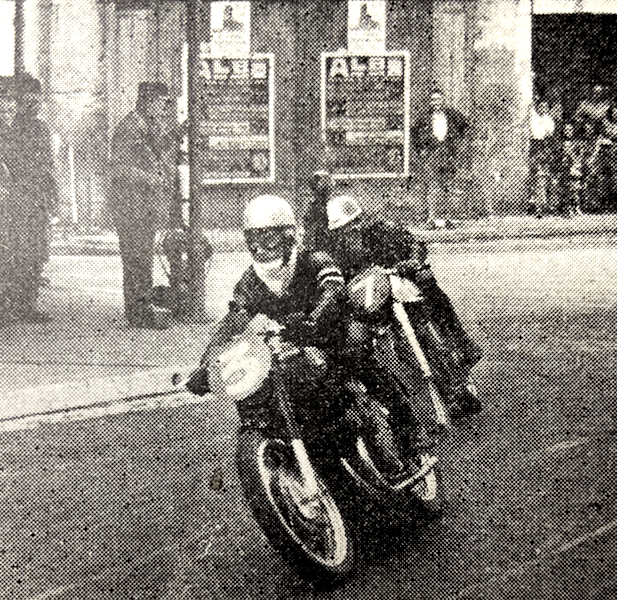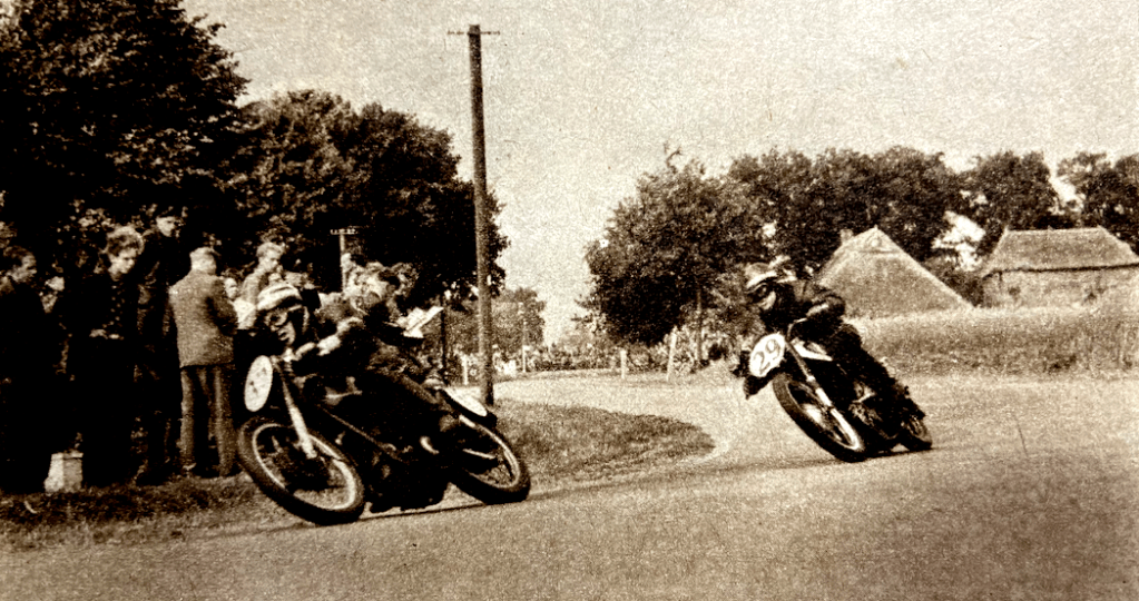 garage mechanic GE Read took his Norton round at 74.87mph in 2hr Omin 56.6sec to capture second place, while GJ Draper, 22-year-old Cheltenham farmer, also astride a Norton, was third with a time of 2hr 1min 10.8sec, an average speed of 74.73mph. It is with regret that we have to add that one competitor, DL Parris, crashed at the Bungalow and sustained injuries from which he died in Noble’s Hospital during the evening. It was the first time the unfortunate rider had raced the TT course, He was 23 years of age, single, and Belonged to Croydon, Surrey. By trade he was a toolmaker. There were several spills, and the high speeds caused many to retire, some through mechanical trouble and others for neglecting the pull of gravity. Only 41 of the 75 starters completed the course. Only Manx entrant to finish was JW Moore, of Douglas, whose competent riding on his BSA brought him eighth place in 2hr 5min 18.4sec, at a speed of 72.28mph. MR McGeagh, of Ramsey, the only other Local rider, retired halfway through the rare with a broken foot-rest. Interesting point is that McGeagh and Moore, whose numbers were 80 and 81 respectively, covered the first lap in the snow time— 32min 45sec. A conspiracy, perhaps? Only other rider with local connections was B Duffy who parted with his Norton on his first lap at Laurel Bank. The Norton, which was extensively damaged, came off worst. The rider emerged unscathed. Southerners may remember Duffy. He lived on the Island until he reached the age of 11, and received his early education at Castletown school. Not to be outdone by the International men. the ‘amateurs’ shot round the course like veterans. So fast did they go that we didn’t have to wait long for that now familiar cry, ‘He’s broken the record!’ And the man in this case was KRV. James (Norton) who caused the first sensation by smashing the lap record—set up by Jackson last year—by 10 seconds. And this on his first lap from a standing start! His time was 29min 35sec, a speed of 76.55mph. Not far behind came BJ Hargreaves astride a BSA with a lap of 29min 57sec. But it does not pay to tempt the gods too much, and first hard luck story had James as its main character. He stopped at the Hawthorne on his second lap and feverishly tinkered with his mount in an attempt to start. This lapse cost him 20 valuable minutes, and he was last to finish. Hargreaves’ clock stopped with its finger pointing to Ramsey, so it was apparent that he too had encountered trouble. This left the way clear for Purslow, who crept— if you will excuse the word—from third to first place on the leader board and retained that position to the end. RESULTS 1, Brian Purslow (BSA) 75.36mph; 2, GE Read (Norton); 3, GJ Draper (Norton); 4, DN Bradshaw (Norton); 5, Derek Farrant (BSA); 6, P Carr (Norton); 7, ST Cooper (Douglas); 8, JW Moore (BSA); 9, CE Staley (BSA); 10, DK Morley (BSA). (Among the DNFs was one Franco Sheene (Royal Enfield) whose son Barry went on to win the odd race. SENIOR CLUBMANS TT After he received a misleading signal from his time-keeper on his last lap, Ivan Wickstead slowed down and lost the Senior Clubman’s Race on Wednesday by only 20 seconds. He had led the field for over three laps. Thirty- four-year-old Kenneth Arbure, astride a Norton, won a few seconds after he crashed at Governor’s Bridge on his last lap. He dogged Wickstead from the start and completed the four-lap 151 miles race in 1hr 53min 37.6sec, over a minute slower than the record of 1hr 52 min 29.6sec, returned by JD Daniels in 1948. Record speed for the race when it was a three-lap event in 1949 was put up by Geoff Duke (82.97mph). Arber’s speed was 79.70mph. Wickstead (32 years), a married man with two children, at the third lap, astride his Triumph was leading by 63 seconds. But helpers waved a board with the cryptic message ‘plus 90′ and this misled him to believe he was 90 seconds ahead. Third man was George Draper (Triumph), a 22-years-old unmarried farmer, of Cheltenham. He finished in 1hr 55min 17sec at a speed of 78.56mph to bring of a double third in one week. He took third place in the Junior Clubman’s Race on Monday. Draper won the Scottish Six Days,’ Trial this year. Fastest lap of the race went to Wickstead, who failed to smash the record—set up by Duke in 1949—by 53 seconds from a standing start. His time for this lap was 27min 56sec. Three Manxmen competed, and one of them, John Wood, 21, of Peel Road, Douglas, captured sixth place on a Norton in 1hr 56min 53sec, only 3min 15.4sec slower than the winner. Twelfth man was WA. Harding, also of Douglas, (Harding’s blue helmet with silver wings was one of the most striking in the race), while the third local rider, R Mawson (Norton) was 38th. Although many crashes took place only one rider needed hospital attention. So tar as visibility was concerned, conditions were perfect. Of the 69 starters, 45 completed the course. DA Gadd (Norton) crashed at Governor’s Bridge, remounted and continued. He later dropped his mount at the pits, but persistent fellow that he is, had the handlebars straightened and set off again. He finished 20th. When two bikes converged at Greeba the handlebars touched. Both riders were thrown but neither suffered. They were AJ Hart (Norton) and P Shepley-Taylor (Norton). Both retired. Clouds of smoke and shouts of ‘Fire!’ from the pit brought spectators to their feet on the Grandstand at the end of the second lap. Firemen rushed to a blazing BSA and extinguished the flames quickly and without fuss with portable extinguishers. Cause of the fire was a burst tank, and the rider of the machine, A. Bates. was burnt out of the race, so to speak. Lap four brought surprises with the damaging message for Wickstead and Arber’s last-minute spill). Despite his mishap Arber pipped Wickstead on the post to win the race. Among those who came off was DRA James (Triumph) whose scene of misfortune was Kate’s Cottage. He suffered minor a