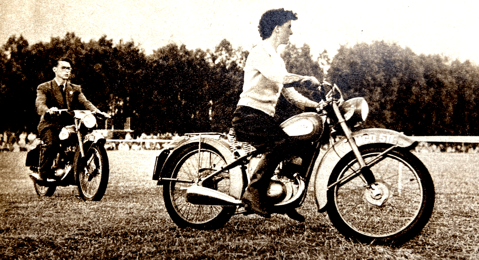 THIS PLEA FOR better training of young motorcyclists was published in the Aussie Daily News and preserved in the excellent Vintage Chatter (magazine of the Vintage MCC of Western Australia): “He’s the one who has asbestos ears held apart by a head full of wet feathers, handlebars grinning sardonically and the power of death between his knees. He’s on the road because the roads are more or less free and he has as much right on it as anyone else. But no one in the world is more hated or grudged his right to the road than he. He’s called a ‘goon’ or a remanded accident going somewhere to happen. He’s the irresponsible youth on a motor cycle. Even death was almost holiday-minded this Easter just past and the National Safety Council felt it was getting somewhere in its years of hammering safety-consciousness into the road-using public. But the wonder was that more handlebar hams didn’t kill themselves as they skite-rode, swooped and cut in through traffic streams. You can’t call it the motor-cycle menace. It’s a percentage of motor-cyclists who are the menace; and I doubt that there’s a motorist or pedestrian in the world who won’t say these types are the worst menace on the road. They make up too great a proportion of the almost 12,500 other motor cyclists licensed in this State. The very sight of a really stylish, fully-dentured, chromium-finished machine with everything on it but the kitchen sink turns the average mature, motorist purple. He wants to put the kitchen sink on it—a governor—and give it the same lethal possibilities as a perambulator. The holder of motor cycle licence plate No 1 in this State has ridden his machine daily for 33 years, has never had an accident, a traffic prosecution or an insurance claim. So I thought he should have some ideas on dangerous riding and how to avoid it. He has plenty. This AG Melrose would make it hard for a boy to get a motor cycle licence. You know of him as a veteran speed-track rider, scramble-track artist who has ridden in most countries of the world, but he worries much about the wizard handlebar boys. He was a civilian instructor to military riders and drivers during the war, and when those boys had taken a great gruelling over scramble courses, heavy sand and mud and learned how to crash, he felt their expectancy of life was a bit longer — in fact, that they had learnt to ride. And when we kill off many more riders and drivers in peacetime than in war, he considers that civilian motor cyclists should be as well taught in peacetime. He would have applicants for licences certified as being mentally as well as physically fit before going before a board, before getting a licence, subject to confirmation, in, say, 90 days. And during that confirmation time the boy would have to go to a school and pass tests before having his licence confirmed. As the law stands the boy does not have to ‘go to school’ before he gets his licence. He has to have a learner’s permit and an instructor who has held a licence for 12 months—and that may be just another young goon who hasn’t had an accident yet. He doesn’t have to have his parent’s consent, but has to produce his birth certificate if he is just 17. But parents have some influence. If a boy of 17 has £200 cash for a new bike or less for a secondhand one, he can get it without reference to you. But many a boy, not having a large lump of cash, has to buy his bike on terms; and his parents must sign the agreement or guarantee it. So make it a condition that he attends the National Safety Council riding school and joins a club afterwards. The NSC is proud of this school, which operates Saturday afternoons at the markets. It has put through about 250 students in two years and as far as the records show, none of those students has been involved in an accident where he has been held blameworthy. A lack of road courtesy is point one in Aubrey Melrose’s idea of accident causes, and comes before straight speeding. So if you parents drill your boy’s manners while he is young, and plug the school attendance and club membership, you can improve his popularity and lengthen his life.”