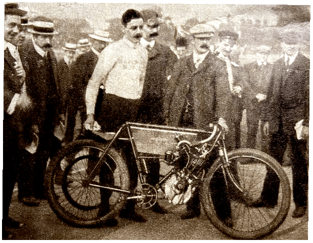 look came over Charlie’s face as he replied. ‘The Triumphs, we knew, were hot stuff for 1907, and we did not under-rate them.’ Then Charlie really got going as he described practising, checking over every detail of the machines, personal care over food, sleep and clothing. (Here you note the experienced, trained mind.) ‘Riders were started in pairs,’ went on Charlie, ‘and with Jack Marshall and F Hulbert the first pair off, we—my brother, Harry, and I—were nicely placed as second pair, one minute later. It was a dull, cold, miserable May morning, and I steadily made up on the Triumph riders, to gain the lead in the first circuit. I retained this lead till the finish, and won by a comfortable margin of nearly 12 minutes from Marshall. During the race my brother Harry made the fastest lap at 41.81mph. I had an uneventful ride, apart from being obliged to use the pedals vigorously in negotiating Creg Willeys Hill on every circuit, and a very near failure to restart after the midway interval. Having earlier been the champion of the Woolwich Cycling Club I was able to give pedal assistance to good effect. This subsequently led to considerable controversy, and for later races, pedalling gear was barred. My winning speed of 38.22mph now seems insignificant, but in mitigation it must be remembered that a petrol consumption heavier than 90mpg entailed disqualification. To accomplish this figure meant very careful use of the throttle, and economising by such expedients as negotiating down gradients on a whiff of gas. Imagine the consternation that such a limit would create if imposed today. Modern riders with their five to six gallon tanks might give it a thought, and then perhaps an average of 38.22mph at 95mpg (which my consumption was measured to be) will