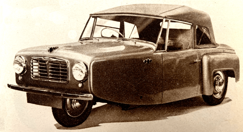 follows well-tried BMW practice with its transverse, horizontally-opposed twin-cylinder engine, shaft-drive, telescopic fork and plunger rear-springing, but its detail conception is new. The 600cc ohv engine is said to develop 38bhp. Unusual features for BMWs are a high-level two-in-one exhaust system and a twin-leading-shoe front brake. Other models on the stand include the well-known 500cc and 600cc ohv twins, and the 250cc ohv single. Two of the most complete of the show surprises are to be found on the Bond Minicar stand. The Bond Minicar itself is in a vastly modified form, and there is an entirely new commercial model called the Sharpe’s 3cwt Utility. The new Minicar has sleek, dummy front wings with inbuilt headlamps. The increased width which results is to allow the front wheel to turn through approximately 160°. Like a fairground ‘Dodgem’ car, the model is said to possess manoeuvrability bordering on the incredulous! There is also a redesigned front suspension unit with a hydraulically controlled trailing arm. The body bulkhead is now a light-alloy
