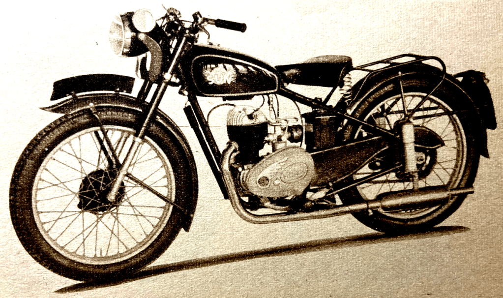 most modern designs in the Show. The sectioned model of the S7 on the export stand is surrounded by admiring enthusiasts. This showpiece not only has all its engine and transmission working and the wheels rising and falling on eccentrics, but it is also rotating, so that the maximum number of enthusiasts can view the machine at the same time. This beautiful sectioned model shows the operation of every part of the machine and gives an insight into the clever design work necessary to achieve such smooth exteriors. Combining almost car silence and smoothness with motor cycle running costs, the Sunbeam makes an attractive sidecar machine. On the ‘home’ stand is an S7 fitted with a single-seat sidecar finished in matching mist-green. For those who require speed with their luxury, the S8, with high-compression pistons and lighter guards and wheels, is a delight to behold. Normal finish on the S8 is black, but it may be obtained with a metallized grey finish. Unusually wide experience in the production of lightweights is possessed by the manufacturers of Sun machines, for they started making Villiers-engine models before the First World War. The fruits