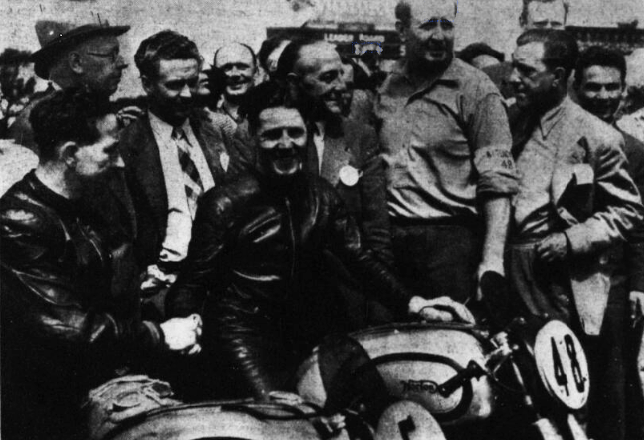 as Duke had started his last. The two foreigners had not challenged the supremacy of the British riders; in fact, we had not heard of them since the start. The Italian, F Benasedo, on a Guzzi, had taken 1hr 56min 30sec to complete his first four laps, nearly 20 minutes slower than Duke, while SA Sorensen (Denmark), on a Norton, had taken 1hr 52min 40sec. The Spanish rider, J de Ortueta, astride a Norton, retired on the fifth lap with engine trouble. By 1pm and lap six the ominous ‘R’ denoting retirements had been painted up under the numbers of 23 men, and there were several laggards on the course of whom news was awaited. The first men were completing the circuit ere this: in fact, Duke had gone on to complete his last 37¾ miles of the race. He was riding imperturbably as ever. Lockett, too, had nothing to grumble about. If only Brett had not parted company with his machine at the Gooseneck, Nortons would have had the team price to-day, as in the Junior on Monday. Unfortunately, the leader-board would change again this trip. Coleman, who had been on the board since the second lap, had had to pack up with a broken chain between Ballacraine and Michael. Very few expected that the race would be over bar the shouting before 1:20, but by that time Duke had finished the distance. Yells of ‘Here he is!’ greeted the signalling of his arrival at Governor’s bridge, and the crowd on the Grandstand rose en masse to greet the winner as he came along the Glencrutchery Straight. The wonder man had done it again, and had achieved a double win for only the fifth time in TT history. His time for the race was 2hr 48min 56.8sec, and he had completed the last lap in 24min 16.8sec, at an average speed of 93.26mph. Something had happened to Lockett! Then came news of his bad luck. The intrepid Nortonite had been compelled to give up the rare at Ramsey with a broken chain. At this time Doran, who would take second place, was coming along the mountain for the last time, and Geoffrey Duke, the winner, was receiving the congratulations those in the royal box. Duke did not ascend the steps to the box in any dignified manner . He ran up them two at a time, and this after a record breaking race of 264 miles. Duke reported that the rear of his machine was covered in oil, and from the 33rd milestone he had hardly been able to keep his feet on the rests, otherwise he had had a good ride. Doran finished the race over 15 minutes after Duke, and although driving No 68 was the third man to complete the distance—a creditable performance—Cromie McCandless driving No 42 having preceded him. RESULTS 1, Geoff Duke (Norton) 93.83mph; 2, Bill Doran (AJS); 3, Cromie McCandless (Norton); 4, Tommy McEwan (Norton); 5, Manliffe Barrington (Norton); 6, A Len Parry (Norton); 7, Eric Briggs (Norton); 8, Albert E Moule (Norton); 9, LV Perry (Norton); 10, Les A Dear (Norton). JUNIOR CLUBMANS TT Riding in his first big rare, BG Purslow, 18-year-old Shrewsbury shop assistant, won the Junior Clubman’s TT in record time on Monday. His time of 2hr 0min 10sec smashed the record set up by BA Jackson last year by 1min 48.2sec. His average speed for the four-lap race over a distance of 150.933 miles was 75.36mph. which bettered Jackson’s record by over one mile an hour. Purslow was not alone in his record-breaking feat. The first five men also beat Jackson’s best. Thirty-one-year-old Wolverhampton