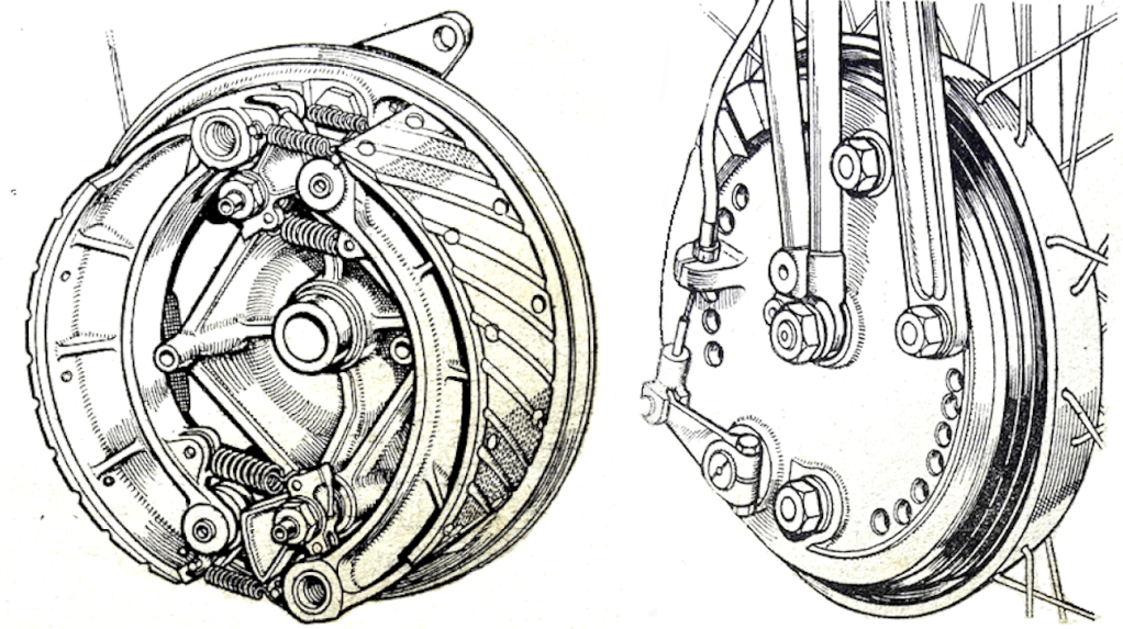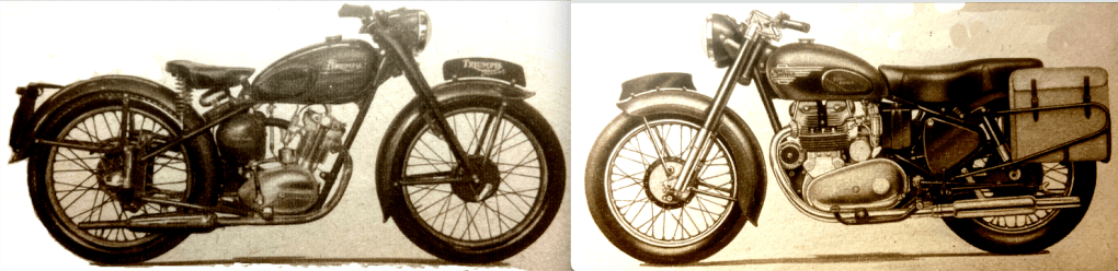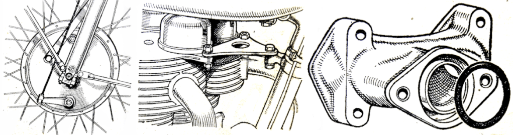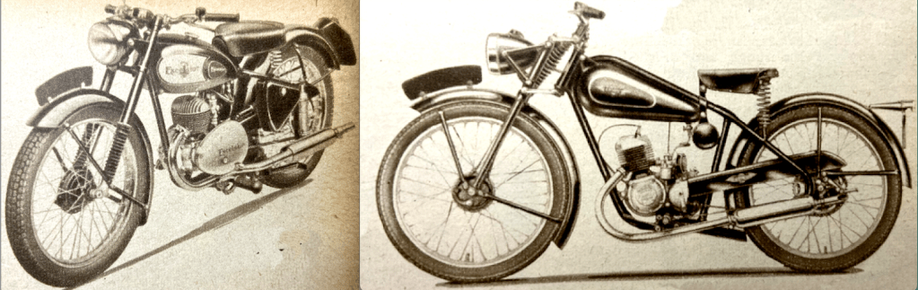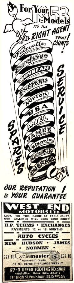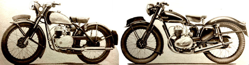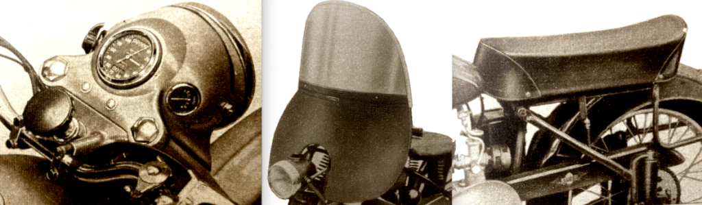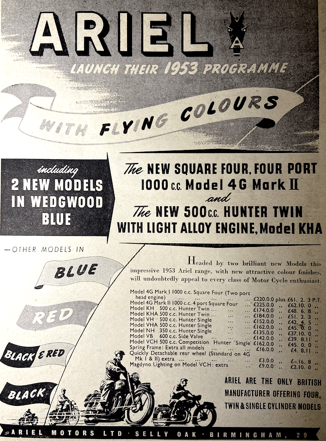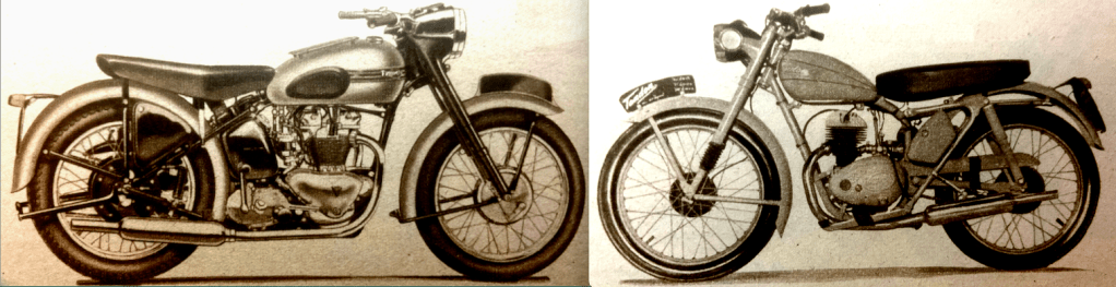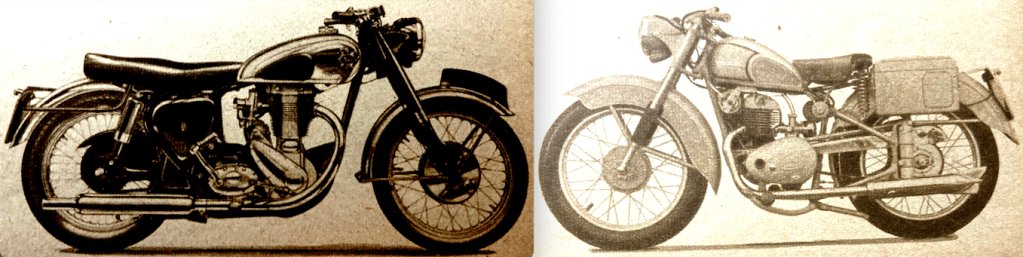 if motor cycle clubs went in for club helmets, instead of club ties, the helmets might become more popular.” The Duke was then presented with a miniature Royal Enfield for his nipper; Prince Charles had just celebrated his fourth birthday. I wonder if KCIII still has it? During his tour of the show Price Philip was shown two exhibits that stood next to each other: a James Comet at £70 5s 7d and a Vincent Black Lightning at £504 14s 5d. He “showed great interest in the triple-camshaft 348cc AJS which was used to capture 21 world’s records at Montlhéry last month [including an hour at 111mph that had been held for 14 years by a blown Guzzi 250] and in the racing Porcupine Twin. On the Norton Stand, he was shown the actual model which Reg Armstrong rode to victory in the Senior TT last June, and discussed the dual-seats fitted to standard machines.” Here’s a selection of other debutantes that might have attracted the Duke’s attention: “A beautifully prepared sectioned working model of the new Ariel Square Four engine is fascinating dozens of enthusiasts at a time on the Ariel stand. World famous