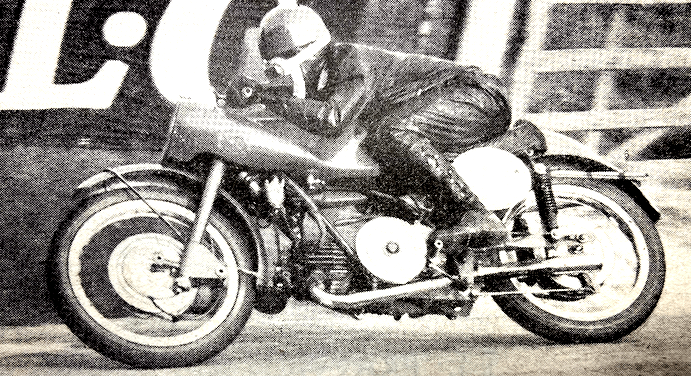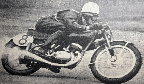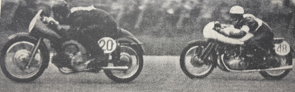 “THE WELL-KNOWN British rider CC Sandford to-day won the Ultra-Lightweight TT at record speed on an Italian Agusta which was originally entered as Les Graham’s mount. Sandford beat off the Mondial challenge and with a lap record on his second circuit he had a comfortable win. Right from the start Sandford put the Agusta in front of the Mondials, and the excitement in the Agusta camp was intense when it was seen that on the first lap he was approaching Cromie McCandless’s winning speed last year and had a lead of 40 seconds over the nearest Mondial, world champion Carlo Ubbiali. Sandford broke the record on his second lap by 17 seconds. at 76.51mph and then had the comfortable lead of over a minute. In the 125cc race the international flavour was supplied by Britain, Italy and Ireland. Men were dispatched at 10-second intervals as usual—there were 17 starters, and within a few minutes there were only 16, as G Newman, on a Dot, packed up at the pits. Sandford, riding Les Graham’s Agusta, was going ‘great guns’. He passed seven men before Ballacraine, and he passed even more before he reached Michael. Favourite was the Italian,