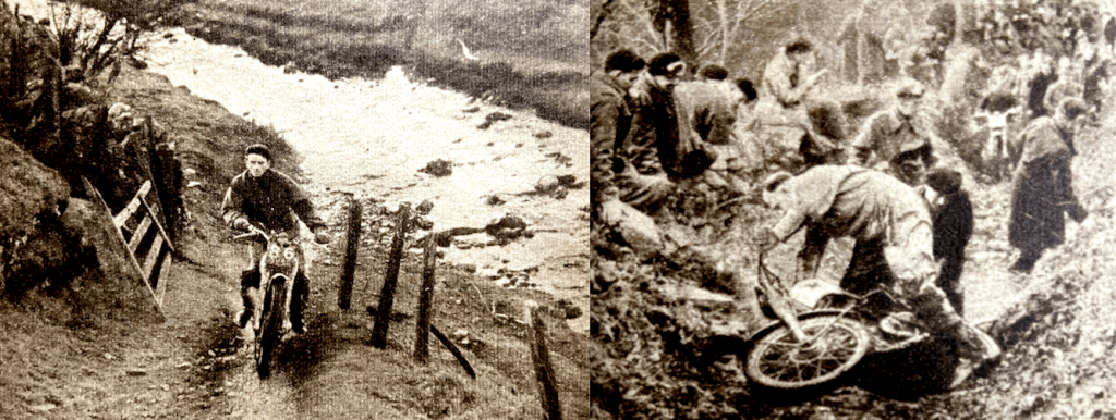 These sections did not create undue trouble, anyway. A typical Dales section was experienced when the macabre-sounding Hell Holes was reached at approximately 10.30am by the first men. Beside the bubbling Marske Beck the section comprised a steep track with wicked tree roots and rock slabs at intervals throughout its length. PL Hodgson (490 Norton), the first arrival, surprised the spectators by picking a sure and faultless path, but DS Tye (348 BSA), CM Ray (497 Ariel) and and JV Smith (490 Norton), in close formation, were halted by running into a ‘baulk’. H Wiley (197 James) had fallen—but retained his bowler hat! BHM Viney (347 AJS), in spite of fine handling, had to use his feet twice and so, too, did W Nicholson (499 BSA). GJ Draper (490 Norton), trying hard not to foot, rolled over. A further section of Hell Holes presented a different kind of problem. The rocks were covered with a slime that would have gladdened the heart of a lubricant advertiser’s copy writer. Competitors in bunches were trying to ride, push, pull or otherwise urge their machines over the top. On Primrose Hill, a new piece near Scotty Hill, GJ Draper (490 Norton) displayed fine mastery in jumping a rock step and then doing a beautiful, slow-balancing act in the rut that followed; in the same place SB Maims (498 AJS) had to foot. TH Archer (490 Norton) earned unstinted applause for a polished performance. David Tye (348 BSA) made a good recovery after some footing. Fourteenth of the main sections, the Steppes provided a climb over a stone-flagged hillside. The flags are said to have been laid by the monks of nearby Marrick Priory—365 steps, it is alleged, although Clerk of Course Eddie Williamson vociferates ‘370, and if you don’t believe me go and count ’em yourself.’ The stones are covered by wet lichen. In ‘Scott’ country the condition is described as ‘slape’—which means that it is equivalent to trying to climb a sloping greasy plank when wearing rubber boots. The chief difficulty proved to be the clearing of failures from the top of the section. JV Brittain (346 Royal Enfield) made a magnificent ascent in spite of some footing, and a very neat showing was achieved by GE Fisher (123 Francis-Barnett). Although The Steppes and Underbanks had both attracted large crowds of keen spectators, the most popular area seemed to be that of the tiny hamlet of Hurst—a group of four or five houses in a vast moorland tract. Hurst is the key point for three observed sections, one of which is Washfold Splash. According to the critical veterans present, the water crossing provided a problem in navigation that indicated that these modern chaps don’t know how to waterproof their motor cycles. Following the splash was a steep, stony path leading to the Schoolhouse. As a short cut it probably ‘blows’ laggard scholars but it presented no difficulty to generous throttle, second gear and firm wrists. There followed the respite of a grassy lane, a descent—into Shaw Gill—and the appalling climb therefrom. Shaw Gill was discovered by the Darlington Club. It has never been climbed clean in previous Scott Trials, but on this occasion the second arrival, SB Matins (498 AJS), swept over the rocky steps with ease. TH Archer (490 Norton) followed, slowly choosing his path. His nonchalance was equalled by G0 McLaughlan (490 Norton), who also fully exploited the low-speed pulling of his engine. Tye (348 BSA) made a fast and perfect ascent, and JV Smith added to the Norton laurels. Could this be the Shaw Gill of last year and the year before? Wait! E Watkinson (197 Francis-Barnett) wavered and fell. But CM Ray (497 Ariel), W Godson (490 Norton), GJ Draper (490 Norton) and W Nicholson (499 BSA) were all clean—’Nick’, apparently, was not at all perturbed by a flat front tyre. E Usher (347 Matchless) did drop a foot. Among the riders of small models, WA Lomas (197 James) was quite master of the situation. Unlike Lomas, however, JG Brown (123 BSA) had both wheels off the ground—front,