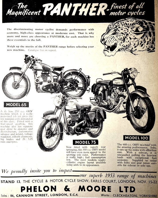 powered by the well-tried 197cc 6E Villiers engine-gear unit, with the drive taken by chain to a single wheel at the rear. This wheel is carried by a pivoted fork sprung and damped by Girling units. Front suspension is by coil springs with Girling hydraulic shock absorbers. All models are now fitted with bucket seats. More protection from the elements has been afforded by an increase in the size of windscreen and scuttle. A worm-and-nut steering box of Burman-Douglas manufacture is employed. Focal points of interest on the Panther stand are the recently announced 248 and 348cc single-cylinder engines with light-alloy cylinders and heads, and the new Panther spring frames. Two of the light-alloy engines, which are for the Stroud competition models only, are on display. The cylinders are gravity castings in Y-alloy with bold finning, a feature which endows them with a most businesslike appearance. As with the standard engines, the push rods are enclosed in a single, external tunnel. So trim and functional do the Stroud models appear that they are provoking more than usual interest by experienced and prospective trials men. Compression ratio for both 248 and 348cc. engines is 7 to 1. Tests carried out with 80-octane fuel are said to have been most satisfactory. At the present time, the spring frames are available only for the 248cc Model 65 and the 349cc Model 75.The 248 and 348cc solid-frame models, and the four 598cc Models 100 on the stand are all equipped with Dowty oleomatic forks, which employ no springs, but rely on air as the suspension medium. An unusual feature of the Panther exhibits (though one that is becoming prominent) is that two-way hydraulic control is provided both by the springing plunger units and the new fork. The bright new colour schemes introduced last year—polychromatic silver-grey and blue—are undoubtedly attractive. Knowledgeable sidecar enthusiasts viewing the 598cc Model 100 with a keen eye. Its Dowry fork is readily adjustable to static load and to provide sidecar or solo trail. All that is n for the latter is to remove the front and turn the