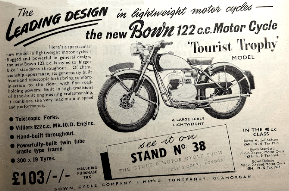 black and chromium; this latter finish is featured on a smart-looking police motor cycle which is on view. Dark maroon with chromium-plated tank panels is the new finish introduced on several models in the BSA range. A completely new dual-green finish distinguishes the latest Star Twins…Over the years, the name Tourist Trophy has become more and more of a misnomer as applied to the famous races in the Isle of Man. Now the name graces also the latest addition to the Bown range, a 125 which is indeed a worthy addition to the ranks of lightweight machines. The Tourist Trophy Bown is on show in two forms, one of which has legshields and a carrier fitted. The machine is powered by the 122cc Villiers Mark 10D engine-gear unit, which is mounted in a duplex frame. A Metal Profiles telescopic front fork is fitted; rubber gaiters protect the sliding parts. Very attractive is the finish, which is in maroon, with metallic-blue tank panels and chromium-plated handlebar and exhaust system…Arrested by the revolutionary styling and striking colours of the Commanders, enthusiasts at Earls Court are discovering that these new British lightweights are not mere outward show. The flowing lines conceal a frame of great strength allied to front and rear springing which is in accordance with the most up-to-date principles…Seamless-drawn steel tubing of square section is employed for the all-welded frame,