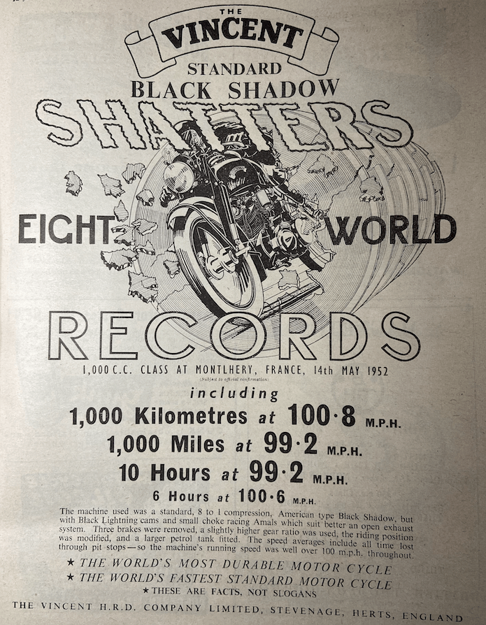 PHIL VINCENT WAS well aware that his big twins’ unmatched performance grabbed the headlines and stimulated sales. Season-long racing was prohibitively expensive; a one-off speed record attempt was the obvious choice for the cash-strapped company whose Black Shadow was the world’s fastest production motor cycle. Vincent had certainly grabbed the headlines when Rollie Free rode a tuned Shad across the Bonneville Salt Flats to set a US record of 150.313mph. And of course he did it in his swimming trunks (read all about it in, and see the unforgettable pic in 1948). But even the best headlines are soon forgotten, so three years a team from Stevenage headed for the banked Montlhéry track in France: the plan was for a Vincent to become the first motor cycle to average over a ton for 24 hours. The Black Shadow engines were tuned beyond the production spec (including Black Lightning cams) but the uncaged roller big-end bearings were left as standard—a decision that would have unfortunate consequences. Other mods included dispensing with both the back-to-back front drum brakes and one of the rears, and a five-gallon fuel tank. The Montlhéry expedition comprised four Black Shadows, two Black Lightnings and a road-registered Black Shadow practice ‘hack’. Phil Vincent headed the support staff himself; the riders were Vincent employees Ted Davis (chief tester), John Surtees (apprentice) and Danny Thomas (tester) plus Cyril Julian, Phil Heath, Denis Lashmar, Gustave LeFevre, Bill Petch, Robin Sherry, Johnny Hodgkin and, of course, Vic Willoughby of The Motor Cycle. The first day of the record attempt ended after six hours when a big-end bearing seized. It failed again the next day, after 11 hours, but by then Vincent had eight records in the bag, including 1,000 miles and 10 hours at 99.2mph; and six hours at 100.6mph. On the third day a Black Lightnings was sent out to set some short-distance records, but after John Surtees had done over 129mph for a couple of laps the rear tyre started to de-laminate, bringing proceedings to a halt. [And now a personal note. Some 30 years later Vic told me that he was riding one of the Shads when the big end failed. It seems the riders were instructed to ride ‘fast enough but no faster’ because ‘PCV’ was well aware that the uncaged rollers could bunch up and fail if the revs were too high. And PCV, according to Vic, remonstrated with him off for ignoring trackside signals and riding too fast. Vic pointed out that da Vinci had designed a caged bearing in the 15th century and urged PCV to follow suit. After which, Vic concluded, PCV didn’t talk to him for two years. Now Vic was harking back 30 years and at the time of writing I’m harking back nearer 40 years. But the caged roller certainly dates back to legendary horologist John Harrison is the 1740s and I know Vic wouldn’t have made up the encounter; he was effortlessly assertive when discussing technical issues.—Ed]