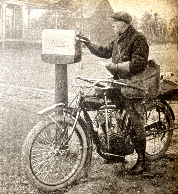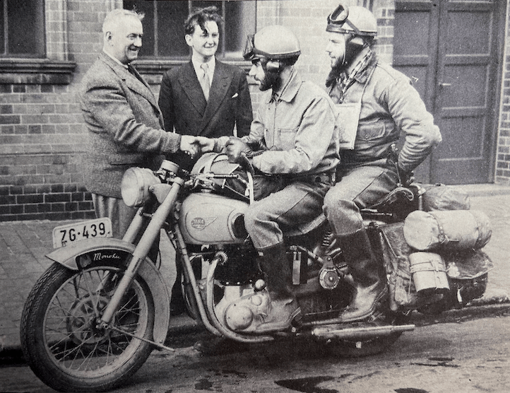 “AN OLDSTER COUNTS the Blessings Brought him in Over Thirty Years of Motorcycling: ‘I suppose that, by the standards of the youngsters who whistle past while I am leaning on a gate with a peaceful cigarette, I am quite an old man; which is a very sobering thought, because it is with great difficulty that I realise that my fiftieth birthday has come and gone, with the quiet, inexorable finality of all birthdays after the forty-first. It was spent in the saddle, where, whenever possible, I have spent all my anniversaries for the last thirty-three years; for, in a life which has had a preponderance of downs rather than ups, I am thankful beyond words that I have nearly always managed to keep some sort of motor cycle. It has often meant all kinds of other sacrifices; the machine itself has not always been what the heart could desire; there have been times when a gallon of petrol meant going without a meal; there has been the joy of new machines, and the heartbreak of old ones. But it has been so well worth while. For motor cycling, though one day it may transport you to Elysium, and the next cast you into the abyss of despair, is, taking it by and large, as good a thing as this world can offer, and far, far better than most. Not for me, frankly, the sporting side. It has always seemed to me an unkind way to treat a beloved companion to drown it in liquid slime, or smash it against unrelenting stone. But that is purely a personal view, and our many-sided game has room, and attractions, enough for all tastes. I have always used my machines for the purpose for which I conceive them to be intended; as a peerless, magic-carpet method of seeing a countryside which, if you know where to go, is still largely unspoiled and as lovely as anywhere on earth. The odd thing, as I see it, is that one can only really appreciate the country from a motor cycle saddle. A lane which, from behind a pair of bars, might well lead to Elfland, as one swings round its bends, and tops the short, steep rises on a waft of the twist grip, loses so much of its charm seen through the windows of four-wheeled transport. One is so detached in a car; there is no sense of speed, nor the odd, striding illusion that the machine between one’s knees is but an extension of one’s limbs and the feeling that one good tweak of the throttle would send machine and rider bounding over the treetops. I don’t think that all this is merely the rambling of early senility, because I have always felt that way about motor cycles, so that I passage about grinning like a cat and singing highly improper songs, a thing I would never wish to do in buses, or trains, or other people’s motor cars. Motor cycles just take me that way. Then there is the motor cycle’s most lovely asset, the ability to wander, swiftly and at will, along the small roads which cars and coaches can mercifully never traverse, through an England so far removed from the trans-Atlanticised vulgarity of the urban centres that it might be whole continents away. Our lives, in this insecure, uneasy post-war world are uncertain, day-to-day affairs, and no one knows what the morrow may hold. Perhaps we motor cyclists are better off than most, because we have the incomparable compensations of our machines, and the all-relieving balm which lies in their gift; so, on the useful principle of gathering roses while we may, let us make the most of them. For my part, I am very grateful that, for another year, I have been able to see under the cloud-flecked skies of autumn, the glories of an English countryside.'”—RK Battson