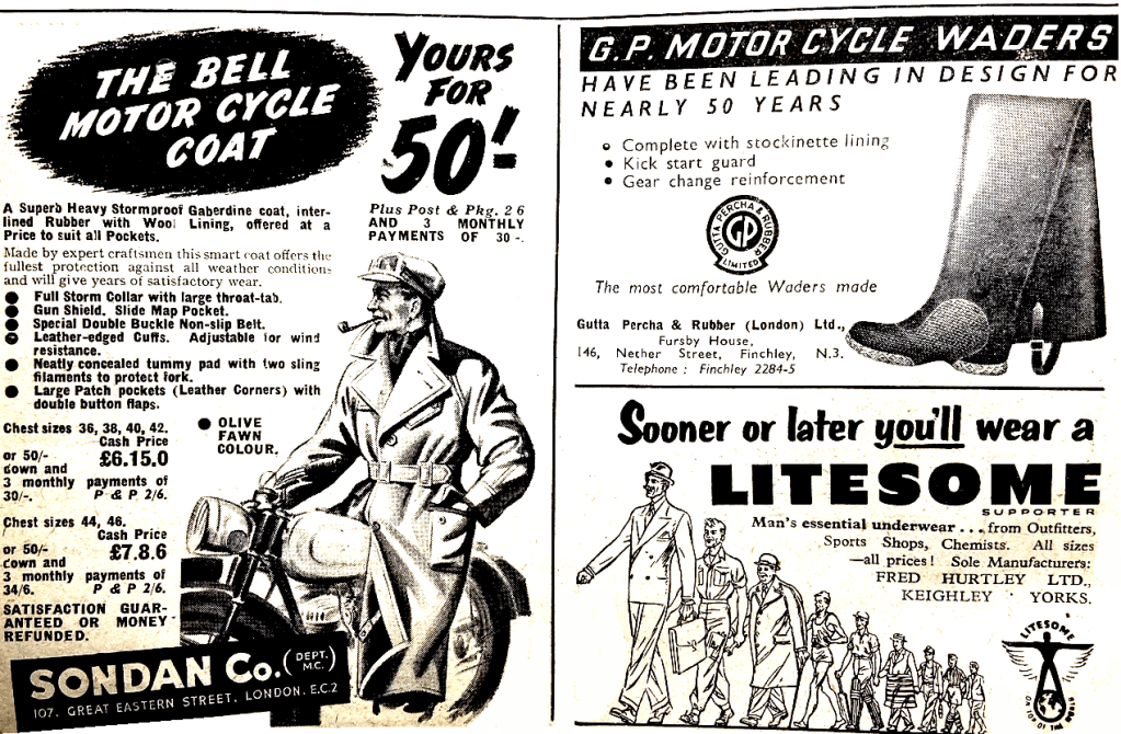 “I HAVE BEEN very interested in Dennis May’s article and the letters in connection with high average speeds and long-distance travel. On the ‘Shadow’, a speed of 80mph is a pleasant amble which can be maintained indefinitely in ordinary clothes, but 100mph is quite a serious matter for which one must have the right conditions and wear a helmet and goggles, as wind noise is very tiring and an ordinary beret can shake one’s head to such an extent that vision is affected. Last year I went to North Wales by way of Worcester and returned the same day; the recorded distance was 596 miles. When I had covered about 450 miles I found that my ordinary speed was becoming a bit of a strain, and I reduced it by 10mph. This happened to be at dusk, which is always a difficult time for riding, but as the evening wore on I completely recovered, and finished the ride at the top of my form—so much so that when I found that the recorded distance was 596 miles I put some more petrol in the tank and made it 602. Unfortunately, I have no experience of the XK120 Jaguar or the J2 Healey, but I have a 1939 2.6-litre MG which is capable of a genuine 90mph. In the car I was recently overtaken at Loudwater, on the London-Oxford road, by a ‘springer’ Norton and in his company had a very pleasant drive as far as Hoover’s factory on Western Avenue. The car was some 10mph faster on the straights but the Norton passed me every time on approaching a roundabout, shooting past at least 15mph faster, due largely to the fact that on a motor cycle one can brake, change gear, and change direction at the same time. Two hundred yards from the last roundabout I was in front, but the Norton just slipped past as usual. I think the whole thing depends upon the quality and response of the vehicle. If the controls are well balanced and are perfectly smooth in operation, the whole vehicle is entirely at one with the driver so that driving is a constant source of pleasure and one can drive without fatigue. But when mental strain is present due to anxiety over arrival time or to shortcomings in the vehicle, one gets equally, tired on either a car or motor cycle. In my particular case my motor cycle is a more outstanding example than my car. I, therefore vote for the motor cycle as being the least tiring to ride.