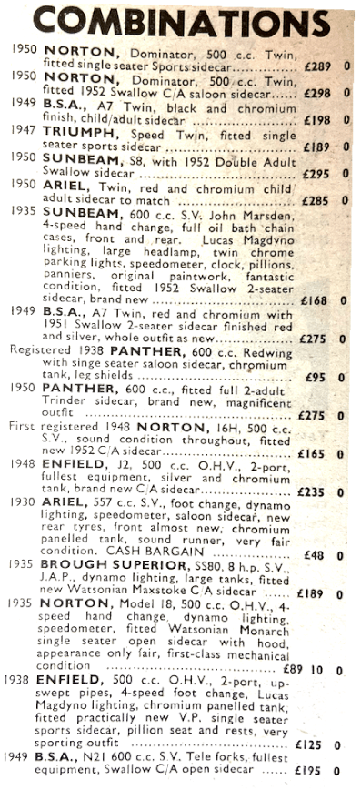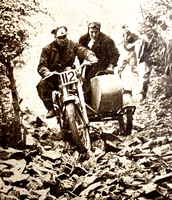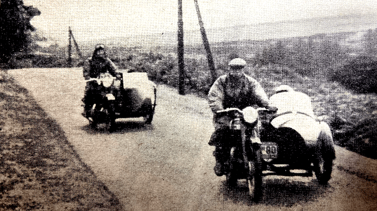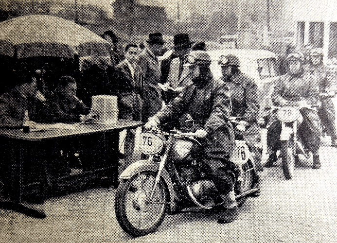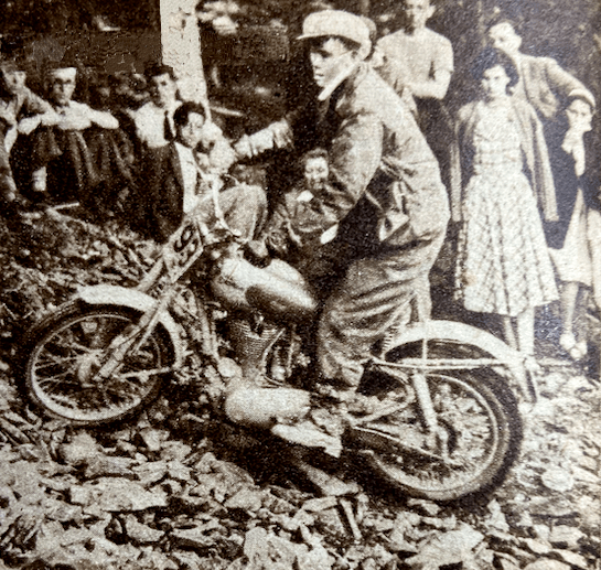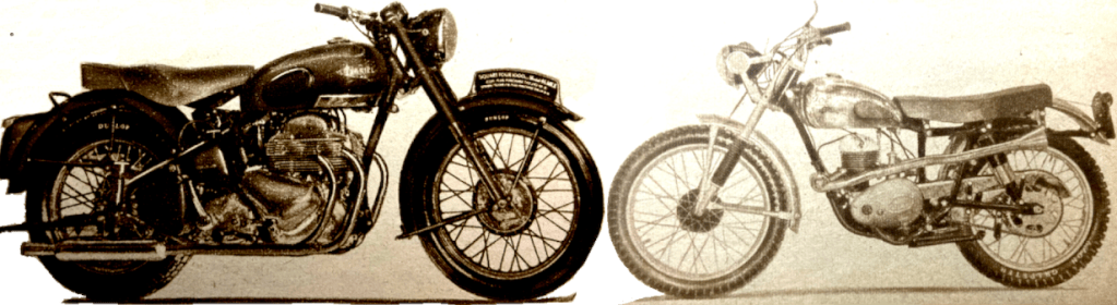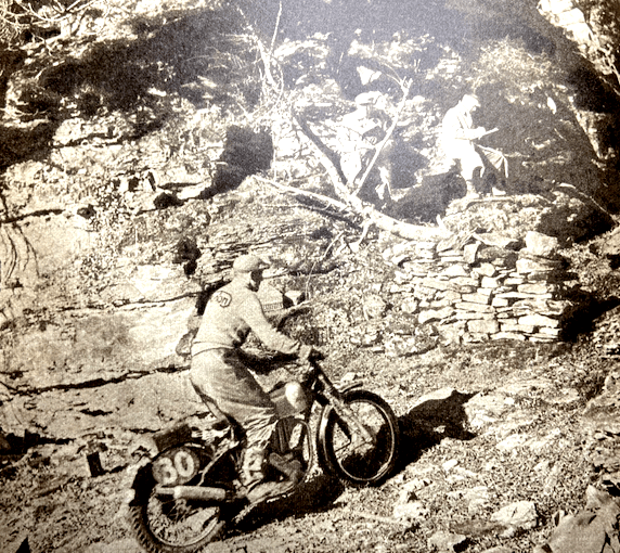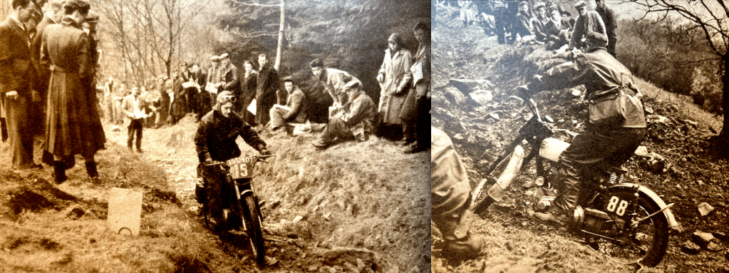 Bantam rider to go through feet up was L Wyer. One of the two lady competitors, Miss Olga Kevelos (497 Ariel) was clean in the early part; then she had trouble in the second sub-section, recovered, and required two dabs. Cefn Coed, the final section, contained a measure of deep mud of plum-duff consistency. Though the section was level and straight, the ruts were long and deep and only JV Smith among the solos rode the entire length unpenalised. JE Breffit (450 Norton) came close to success, but was forced to use three dabs—two of them when he was almost at the ‘ends’ card. Strangely enough, in the circumstances, FH Whittle (598 Panther sc) and F Wilkins (497 Ariel sc) drove their sidecar outfits through fast in great style without losing marks. Early morning mist and a clear blue sky above heralded another glorious day on Saturday for the second half of the trial. Machines had been impounded during the night and there was an easy-starting test before riders set off—this was in addition to the three other special tests (acceleration and braking) during the event. Eight observed sections were included in the course of Saturday’s route of 114 miles, which was also timed, of course. At the first section, LIwyncutta, spectators were treated to a masterly display from DM Viney (347 AJS). Viney inveigled his machine over muddy rock slabs and through a quagmire at the exit from the section with all the grace and skill that is his alone. A praiseworthy performance was made also by the second of the two lady competitors, Miss Joan Slack (197 Dot). Many excellent sections were included in the day’s route, but the highlight was Kinsley, the long stony track bristling with rock ledges, that climbs steeply up the side of a 300ft cliff towering above the roofs of Knighton. It was said that no one had ever climbed it unpenalised, and it presented for riders an awe-inspiring prospect. There was an early sensation when F Allen (123 BSA) rode feet-up almost to the top before hopping out of the saddle when his engine was about to stall. One after the other, the experts were defeated. Most of them made non-stop climbs by dint of heavy footing, and the bulk of the remainder of the entry required tow-rope assistance. The spirited charge by HL Williams (490 Norton) was typical of many who forfeited a non-stop climb in a gallant attempt to ride the entire section feet-up. Williams stormed his way over the worst part with his feet glued firmly to the rests, but eight yards from the end he lost control and dropped the model. When most of the entry had passed Johnny Brittain arrived, still with a clean sheet for the day—he had only lost four marks the previous day and was at this stage in the lead. After carefully weighing the prospects, he made a superbly-judged climb, and a tremendous cheer arose from the crowds thronging the banks when he rocketed out of the section still under control and still feet-up. Not only had he made almost certain of winning the trial but he had made local history by being first to conquer the hill. A word of praise is merited by Clerk of the Course, HP Bangham, and his merry band of fellow organisers. They did a first-class job—a really first-class job throughout the two days. RESULTS Welsh Solo Trophy: JV Brittain (346 Royal Enfield), 4 marks lost. Welsh Sidecar Trophy: F Wilkins (497 Ariel sc) 31. Knighton Cup (best 150): EW Smith (122 Francis-Barnett), 32. Llandrindod Cup (best 260): R Armsden (197 Francis-Barnett), 27. Rhayader Cup (best 350): DS Tye (348 BSA), 9. Metropole Cup (best unlimited cc): PJ Mellers (497 Ariel), 9. Spa Cup (best 350 sidecar): RU Holoway (348 Panther sc), 67. Walters Cup (best unlimited cc sidecar), AG Brown (490 Norton sc), 45. Builth Trophy (best one-make team): AJS (BHM Viney, GL Jackson, PF Richards), 74. Presteign Cup (best club team): Sunbeam MCC (GL Jackson, PJ Mellars, J Giles), 31. Morgan Cup (best Mid-Wales member): WB Mills (498 Triumph), 27. Services Cup (best Army rider): L/Cpl JSH Bray (348 Matchless), 42.”