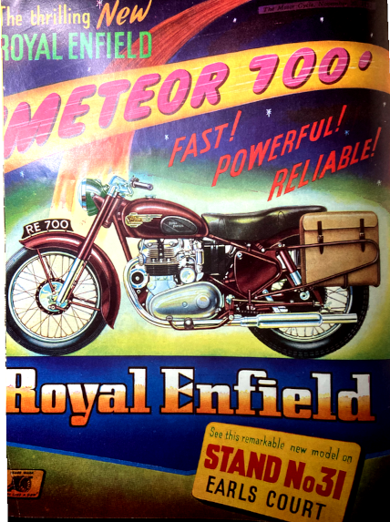 fork sliders through 180°. The exciting new Royal Enfield 700 Meteor twin. is featured in conjunction with a Watsonian sidecar. The Meteor is fitted as standard with a specially robust rear fork designed to make the spring-frame entirely suitable to withstand the stresses imposed by high-speed side-car driving. In solo trim, the Meteor is an extremely fleet sports tourer. Heavier than the well-proved 500 twin by only 10 or 12lb, the engine churns out 36hp at 6,000rpm. From the crankcase upward, the Meteor engine is not unlike two 350s side-by-side. Two separate cast-iron cylinder barrels are deeply spigoted into the crank-case and surmounted by separate, light-alloy cylinder heads. Compression ratio is 6.5 to 1. The Meteor has a 7in-diameter rear brake, and a 6in dual front brake with compensated twin cables operated by a single handlebar lever. The front fork is modified internally to provide increased damping on reaction. The popular 350 Bullet sports single is shown in road and trials trim. The new 500 Bullet is likely to become equally popular. Bottom half of the new Bullet is basically the same as that of its forerunner, but there is additional bearing support for the crank-shaft. Power output is given as 25hp at 5,250rpm. Like the Meteor, this model is equipped with the stiffened-up rear fork to make it suitable for sidecar work if desired. An excellent feature is that the stop-light switch is housed in the toolbox. Yet another new model on the Royal Enfield stand is the 148cc Ensign—an attractive lightweight two-stroke which, complete with pivoted-fork rear springing, retails at a total price below £100. The power unit is a compact, three-speed engine-gear unit, a development of the famous 125cc RE model. Seat covers are brown—to match the machine finish. As in past years, the Sunbeam