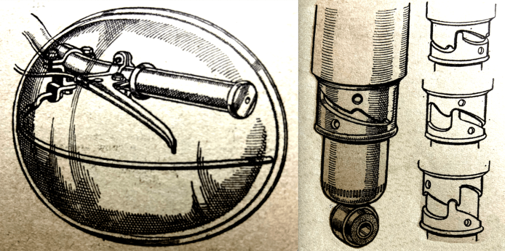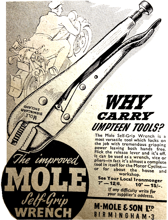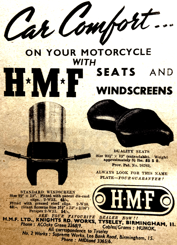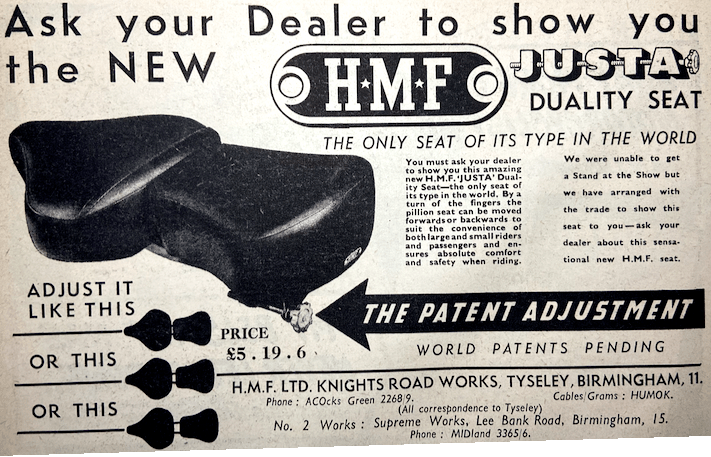 “HANDLEBAR GRIPS IN PVC (Polyvinyl Chloride) manufactured by The DM Industrial Plastics Co (Kingsbridge Road, Cottimore Lane, Walton-on-Thames) are produced at 2s per pair. Cast in a deep tread pattern, the grips are softer than rubber and they are claimed to ensure a perfect grip under all conditions, even if the model has been dropped in mud. Other DM products include plastic fork gaiters (those fitted to the James, BSA Bantam and Tandon lightweights) and spark plug covers.”