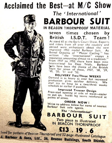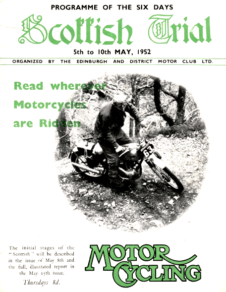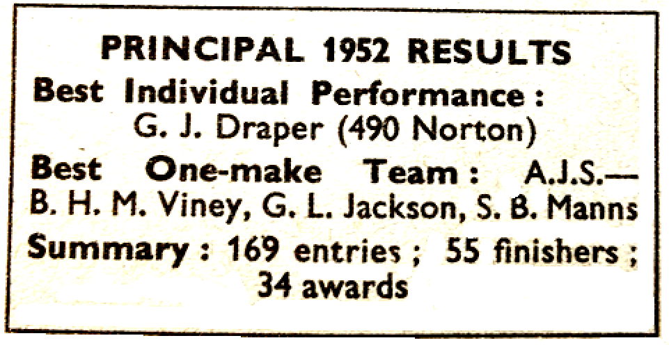 front wheel up the steep leaf-mould bank on the right and put the rear wheel through the gap on the right to avoid the path-blocking boulder. It looked so easy, so impudent, that it took the breath away. Like several others in the trial, Draper was wearing the experimental plastic-covered cloth Barbour suit; it is to be called the Barbourette. The lunch stop was five miles farther on at Killin, which lies at the western end of Loch Tay. From here menacing clouds could be seen hovering over the Glencoe area. Locals maintained that heavy rain was already falling thereabouts, but they were mistaken. The run through the Glen of Weeping was one of sheer delight from beginning to end. Near Kinlochleven was the formidable Mamore, the final section of the day. With its many notorious corners the hill is a law unto itself. It is very long. The surface is of loose stones—stones which shoot uselessly away from spinning rear tyres. Because of the dry spell which had preceded the trial, the surface was even more loose than usual. Of the lightweights, only WA Lomas (197 James) could deal successfully with the hill’s higher reaches. He used all the speed he could muster up to Flook’s Corner, nipped smartly round the turn and rode over the loose with as fine an exhibition of throttle control as has been seen in many a day. Few Scottish Six Days’ events take plan without someone running over the edge of the Mamore track. The honour for the first slip of this kind in the 1952 Trial went to G. Coope (248 BSA). As he went over the edge. he threw his arms around a tree and pulled himself off the machine. Then, humorously, he hugged the tree in exaggerated recognition of a service well rendered. The end was not yet in sight. Ahead lay the rocky, rutted 11 miles or so of the old Mamore road leading to Fort William. The track provides great scope for zestful rough-stuff riding and fittingly concluded such an enjoyable day’s riding. The total mileage covered had been 182. At 10.40pm the day’s results were avail-able. These showed that only GJ Draper (490 Norton) had retained a clean sheet. The runner-up, with five marks lost (one stop), was PH Alves (498 Triumph). Next came JV Brittain (346 Royal Enfield) and BW Martin (348 BSA), each with six marks lost. They were followed by G Parsons (348 Ariel), with eight marks gone; and he was followed by TU Ellis (499 BSA), David Tye (348 BSA) and GL Jackson (347 AJS), all with nine marks lost. Best in the under-200cc class was WA Lomas (197 James), with 19 marks lost.” Five days later Johnny Brittain won the 1952 Scottish Six Days Trial; he finished with 22 marks lost.