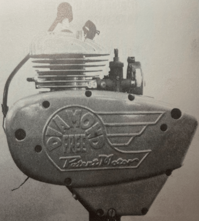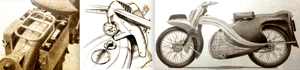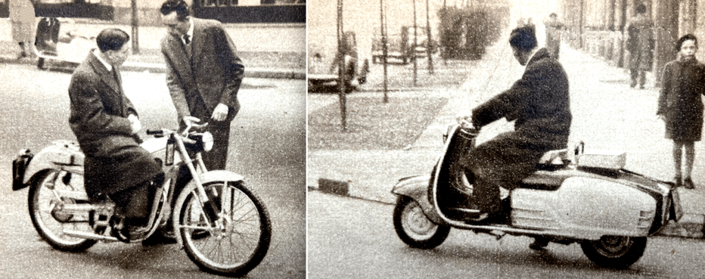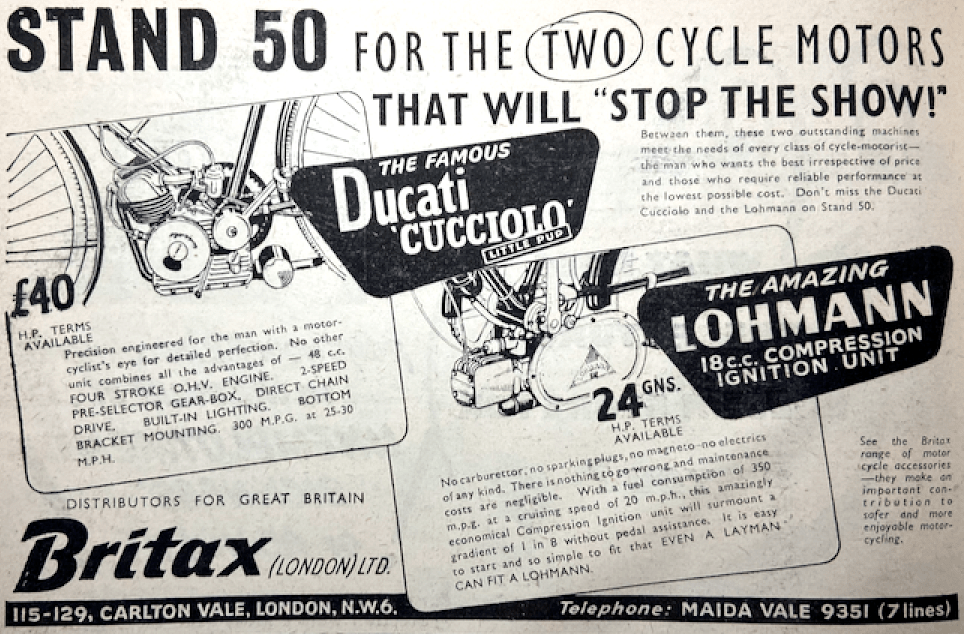 UNDER THE OPTIMISTIC heading “Welcome to the Push-less Era” the Blue ‘Un reviewed the “cyclemotors and under-60cc machines at Earls Court. The 11 exhibitors were Berini (Dutch 32cc two-stroke with an Amal carb and Wipac flywheel mag); Cucciolo (Italian 48cc ohv); Cyclaid (31cc two-stroke “horizontally mounted over the rear wheel” with V-belt transmission); Cyclemaster (a 32cc two-stroke built into the rear wheel); Lohmann (18cc compression ignition driving the rear wheel via a friction roller); Mini-Motor 49.9cc two-stroke, also driving via a roller—”considerable interest is shown in the Trojan engine-gear unit, available to cycle manufacturers); Mobylette (49.9cc two-stroke); Mocyc (49cc two stroke “mounted on a sub-frame attached to the front wheel spindle” a driving via a roller); Mosquito (Italian 38cc two-stroke “Mosquito-equipped cycles which gained awards in the ACU National Rally are on view); Power Pak (“A robustly built, all-British 49cc two-stroke); and the French Solex (45cc two-stroke “available only as a complete motorised cycle”). Here are some more details of products that were laying the foundations of the moped sector. “If anybody had told me two years ago that an 18cc engine would be seriously marketed for clip-on use, I should have jeered at him…The wee German two-stroke Lohmann engine can be run on paraffin or diesel oil (or, I believe, on any fuel oil), can touch 20mph and may average 350mpg…An 18cc two-stroke compression-ignition unit, the Lohmann has neither carburettor nor spark equipment. It is mounted at the cycle bottom bracket and drives the rear tyre through a