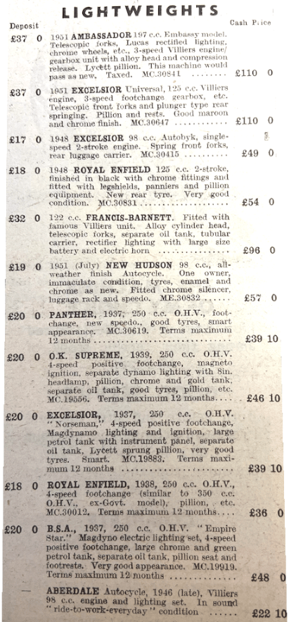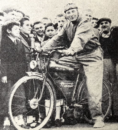 machines equipped with internally expanding hub brakes, or with coaster hubs, achieved much better results, One Cyclemotor rider had fitted a 4in front brake—just to be sure! Early arrival at the finish entailed disqualification, but each rider was allowed three minutes after his expected time of arrival. There were two retirements, one through mechanical trouble. The pint of petroil issued to each machine at the start brought all home, though some competitors admitted that the fuel level was on the low side at the end. First-class certificates were awarded for retention of 90 out of 100 marks, and second-class certificates for an 80% performance. The trial appeared to be highly popular with the competitors, and one even suggested that similar events should be run weekly. RESULTS First-class Awards: FG Cosson (38cc Bantamoto), R Dendy (48cc Cucciolo), K Poole (48cc Cucciolo), AW Jones (48cc Cucciolo), CW Saville (31cc Cyclaid), T Gould (31cc Cyclaid), R Miles (25cc Cyclemaster), J Macielinski (48cc Miller), T Smith (48cc Miller), K Mercer (49cc Mini-Motor), A Pointer (49cc Mini-Motor), F Allen (38cc Mosquito), D Shallcross (49cc Power Pak), H Easton (49cc Power Pak), J Latta (49cc Tailwind). Second-Class Awards: P Longsmore (38cc Bantamoto), J Cooke (32 Berini), I Caswell (32 Berini), F Rasch (32 Berini), P Hodge (32 Berini), T Geyther (31cc Cyclaid), K Whiting (25cc Cycle-master), J Meyrick (25cc Cyclemaster),B Bollen (25cc Cyclemaster), G Ryan (25cc Cyclemaster), D Brown (25cc Cyclemaster), G Denton (49cc Mini-Motor), RK Sergent (38cc Mosquito), W Manley (49cc Power Pak), 0 Udall (49cc Power Pak). A Gatto (49cc Power Pak), A Smith (49cc Tailwind).”