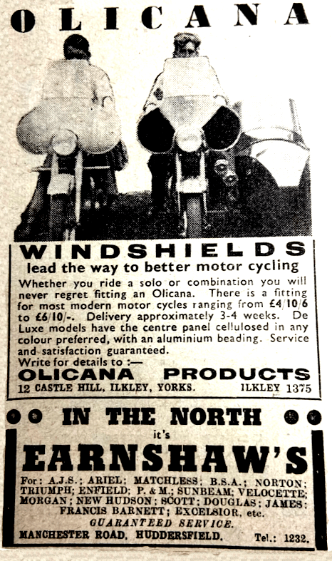 “‘Medico’ owns a Black Shadow, a Jowett Javelin and a Healey. His mature verdict is that a really long run, ie, up to 400-500 miles in the day, produces far more physical exhaustion on two wheels than on four. Though his two-wheeler is fully sprung, the contrast necessarily pivots on comfort. I have personally noted the same facts, and have always failed to reach a satisfactory analysis. For example, I remember covering 514 miles on a summer’s day (Glasgow to the South Coast), seated alone in a small sports car with not very fat tyres and quite simple suspension. I finished physically fresh. But I have never done 500 miles in the day on two wheels without feeling so punished that a boil-ing hot bath was required to remove the stiffness. Why? Is lack of support for (a) the shoulders, and (b) the hams, the main cause? There seems to, be little difference in the severity of bumps or the total of vibration. Nevertheless, there is a pronounced contrast in the total punishment…Medico accurately remarks that motor cycle head lamps are very substantially inferior to car dittoes, and explains why motor cycles cannot easily put up such high averages over a long distance. Technically he is correct. But I am all against long-distance high averages including any night element at all, nor do I really yearn for more potent motor cycle head lamps. There are a dozen arguments against them—high cost, considerable weight, bigger dynamos, bigger cells, and above all, the risk of young fools abusing so fierce a beam. To be frank, all really powerful head lamps are a confounded nuisance to the majority of road users; and I doubt whether any of us should use lamps substantially exceeding a reasonable level of illumination. I have often wished for a head lamp with a broader and more diffused beam, but I have no wish for a searchlight type.”—Ixion