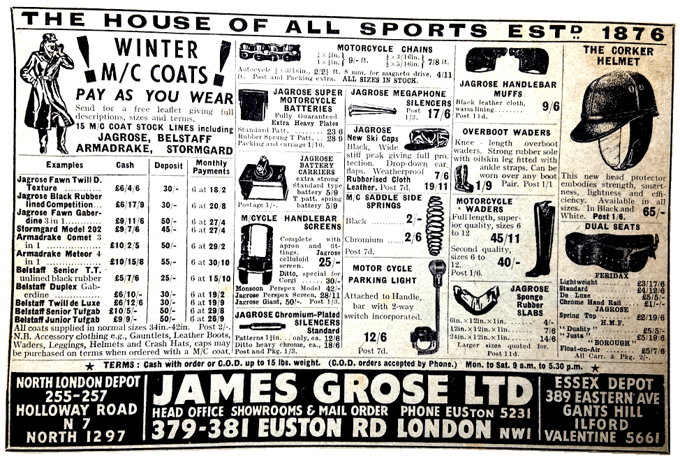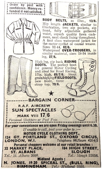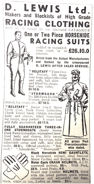 “I THOUGHT I HAD been asked all the questions which can be put to a motor cycle journalist, but a Midland lady has struck new ground. Will I help her to choose a motor cycling coat with which to surprise her husband on an anniversary? I will NOT! The earth is full of sweet young things who imagine they know all about ‘his’ tastes, for example, in cigars and ties. The ‘surprises’ operated by such damsels could be more truthfully described as shocks. In this gift sphere we males have far more sense than the cunninger sex. Orchids? Yes! Chocolates? Yes! Cigarettes? Yes! Jewellery? Perhaps! But garments—no, no, NO! After many years of married life I wouldn’t-dare to buy a hat, or even a frock, or even a nightie, for my ‘her’. She would probably burst into tears at the first glimpse of the hat, and the undies of my choice would assuredly be the wrong colour. Give the brute the money, and let him choose. (The gift of the money will probably be as big a surprise as the arrival of a £7 coat which he hasn’t ordered could ever be; and it leaves him free to make his own pick.)”—Ixion