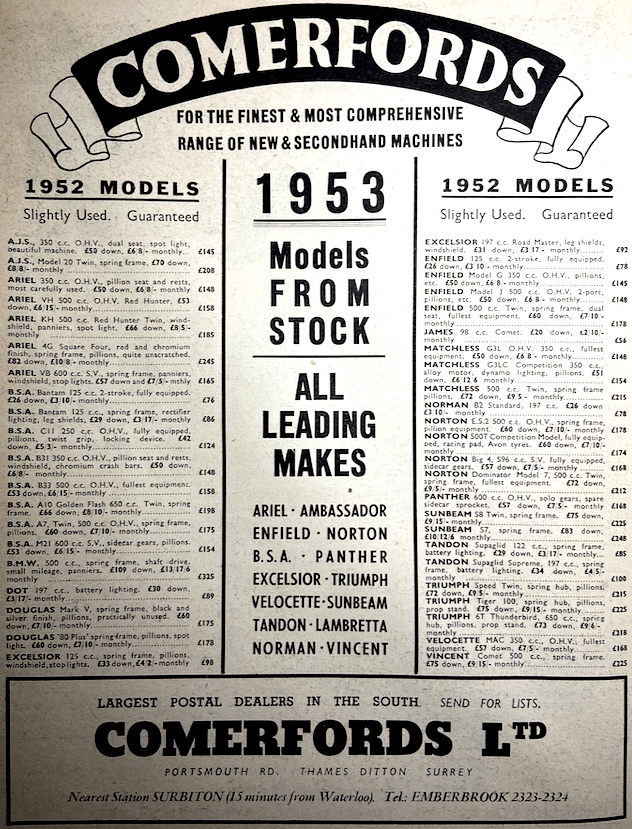 “AT THE PREHISTORIC SHOWS, the trial run was at least as important as visual inspection of decorated stands. Many of the visitors had never thrown a leg over a motor cycle saddle, and more needed persuading that motor cycles were both safe and practical. So long as we formed a tiny percentage of the population, local agents were loth to stock even a single machine for window-dressing purposes, and the various makes differed so profoundly in comfort and other aspects of appeal that a trial run was indispensable to a keen buyer. Some of those Shows were located with a view to giving trial runs, and a squad of testers would be available outside to shepherd the trembling novice. The custom of organising trial runs died so hard that even in these days of lordly provincial agencies with enormous stocks, the odd trial bus or two may still haunt the back premises of Earls Court. But central London is no place for a trial run. If an intending buyer wants to sample the model before he signs on the dotted line, he will be wise to arrange for a trip at home, where local agents will go out of their way to assist him. Of course, in these days quality and design have reached a pitch at which a trial run is no longer necessary. On the other hand, it remains almost as desirable as ever it was. The necessity centres round two special aspects. The first is to clinch your selection. You are buying a 500cc parallel twin, for example. Their name is now almost legion. You have narrowed your choice down by eye and by meditation to two makes. They may be largely what Giles would call the ‘dead spit of each other’. But you are a connoisseur, and you’d feel more comfortable if you could contrast them at the only place where knowledge is decisive, ie, on the road. The second aspect only arises if you are a giant or a dwarf. The human body is extraordinarily adaptable. I am an outsize, and quite often the first half hour aboard a new buy has felt so frightful that I have decided to get rid of it quickly. Yet within a few hours my flexible body has developed that centaur-like feeling which welds owner and model into a single entity. Yet once—and not so long ago, either—I verbally ordered a new model which had bewitched me, and later had to enrage the vendor by demonstrating that no juggling with saddle, foot-rests, etc could ever make me feel at home upon it.”—Ixion