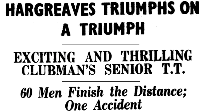 “BERNARD HARGREAVES. THE WINNER, was married in April. He and his wife deferred their honeymoon so that he might race in the isle of Man. She was the first to welcome him home safely—as well she might when she saw that the nut from his rear wheel was missing, and the rev-counter was swinging in front of the handlebars. With his right arm still disabled by an injury he received in last year’s practice Arthur Bint, of Reading, Berks, pluckily turned up again this year, this time as a mechanic for his friend, Jack Hill, of Reading, who rode a Triumph.”