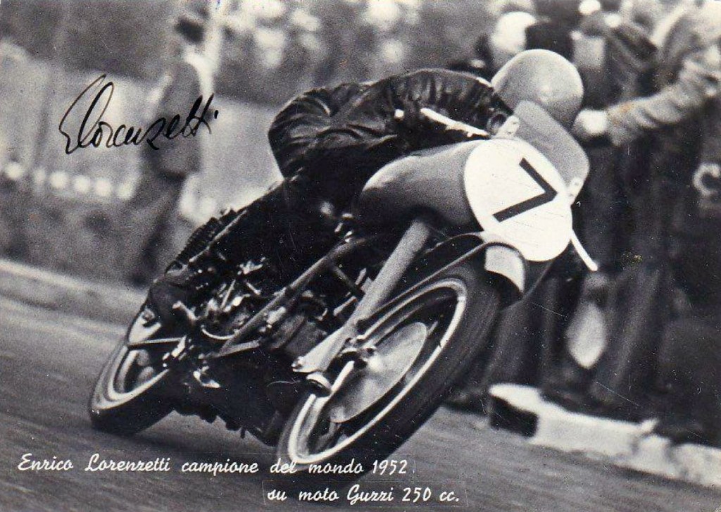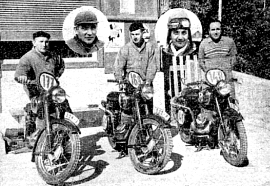 “WHICH GUZZI? THAT was the only question in the LIGHTWEIGHT TT, [according to the Isle of Man Times] and Bruno Ruffo, the 1951 world champion in this class, nearly supplied the answer with record laps in the second and third circuits, which gave him a lead he never lost until the last lap. Then came the sensational report that he had been given a wrong signal and was slowing down, but from the Gooseneck he was reported to be ‘touring’. This let in Fergus Anderson to win from team-male Lorenzetti. Anderson, 43-year-old wartime Admiralty ferry pilot, won in 1hr 48min 8.6sec, an average speed of 83.82mph. Only 32 seconds behind came Lorenzetti in 1hr 48min 40.8sec at 83.36mph, with Sid Lawton (Southampton) third in 1hr 49min 43.2sec, 82.54mph. Fourth, fifth and sixth were Les Graham (Velocette), Maurice Cann (Moto Guzzi) and Bruno Ruffo (Moto-Guzzi) respectively. So Moto-Guzzis occupied five of the first six places…How different was this day from that of the Junior Race. The sun hid behind grey clouds and a cold wind played round the Grandstand. But it was an ideal day for racing. At 9.45am the starter’s flag dropped to unleash the first machine, a Pike-Rudge, who shot away into the first lap of this four-lap, 151 miles race, over one of the toughest courses in the world. Sixth away was Maurice Cann, the 1948 winner, and the man with the most knowledge of the course, and only 10 seconds behind him Enrico Lorenzetti, one of the Italian aces, sped away towards Bray Hill. There were prospects of a duel here, although Moto-Guzzi against Moto-Guzzi was not so thrilling as an Italian machine versus a