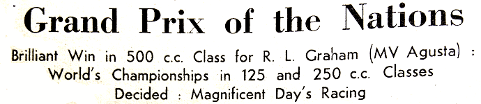 THIS WAS THE FOURTH FIM Road Racing World Championship Grand Prix season. It comprised eight Grand Prix races in five classes: 500cc, 350cc, 250cc, 125cc and 500cc Sidecars. It began on 18 May, with Swiss Grand Prix and ended with the Spanish Grand Prix on 5 October. On the face of it British bikes still led the pack, at least in the 350 and 500cc classes. At the Swiss Grand Prix AJSs finished 1st and 2nd in the 500cc class, with an MV 3rd; a Norton (inevitably ridden by Geoff Duke) led the 350s home followed by an Ajay and another Norton. But it was clear that the lightweight classes were no longer British territory; Fergus Anderson won the 250 race on a Guzzi. Harry Louis, who was to have an illustrious career as editor of the Blue ‘Un, took a well informed look at the Continental challenge: “A most impressive feature of the 500cc race of the Swiss Grand Prix at Berne was the speed and reliability of the new Italian MV Agustas.