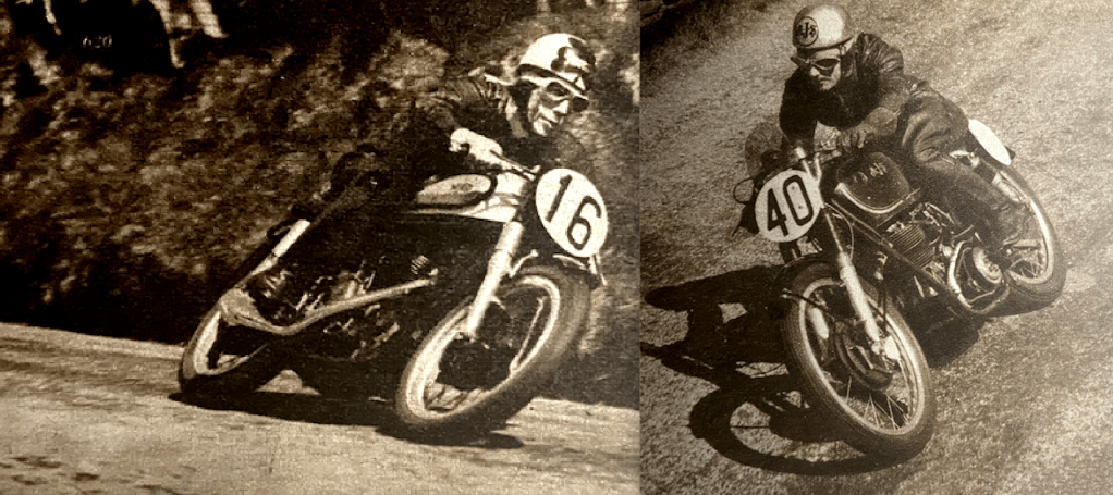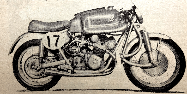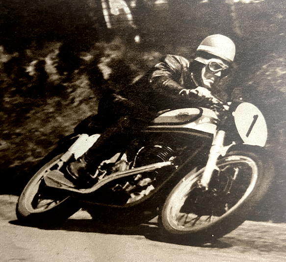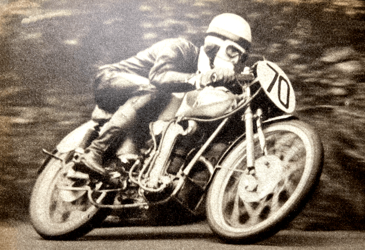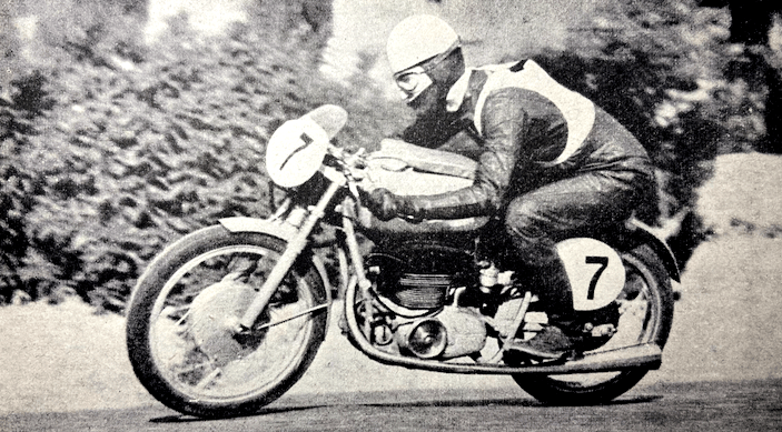 on his first circuit. Parry went through the Start going well. Sandford streaked away on this the last lap for the ‘Tiddlers’ and won the race—so it was an Anglo-Italian victory. He fled round the course crouched low over the handlebars, an easy winner and a popular one. Sandford had finished the course when it was announced that Milton Sunderland had parked up at the Highlander on his second lap. This was the first year in 18 entries that Sunderland had failed to finish the distance. There was drama too in this last lap. Cromie McCandless. who had crept into third place by reason of Parry’s stop at quarter Bridge, was signalled pushing in from Governor’s Bridge, so Parry came into his own again. The first three men to finish were Sandford, Ubbiali and Parry. So fast did the leaders go in the Ultra Lightweight TT race that very few riders received replicas as the times for which are harnessed to the winner’s time. Only the first five received first-class replicas, and there was a lone second-class replica, FH Burman, who finished sixth. Of 17 starters, 12, or nearly 71%, finished. Replica times were 1hr 38min 54.2sec for first class and 1hr 47min 53.6sec for second class.” RESULTS: 1, Cecil Sandford (MV Agusta), 75.54mph; 2, Carlo Ubbiali (Mondial); 3, Len Parry (Mondial); 4, Cromie McCandless (Mondial); 5, Angelo Copeta (MV Agusta); 6, Frank Burman (EMC-Puch); 7, Harvey Williams (BSA); 8, Howard Grindley (DMW-Royal Enfield ); 9, Noel Mavrogordato (EMC-Puch); 10, Eric Hardy (Dot).”