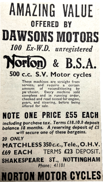 “HOW IS THIS for a coincidence? I sold KK6617, a single-gear Norton, 29 years ago and have not set eyes on it until, a few days ago, I called at the store of Dodgers, Norwich, owned by the brothers Kerrison. I made my purchase of a clothes line prop and began talking about old bikes to Percy Kerrison. He took me through to the back of his premises, and there stood my old Norton—still in very good order, and so proudly owned that a hundred pounds cannot buy it.