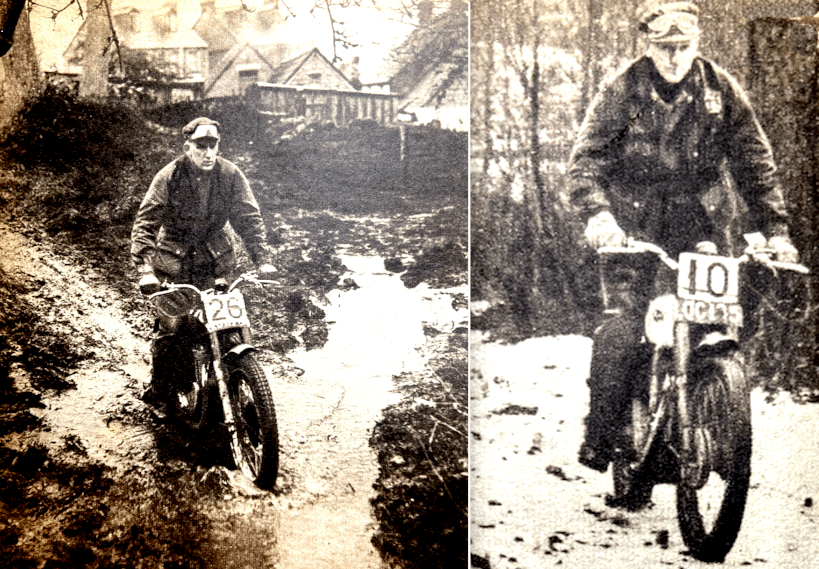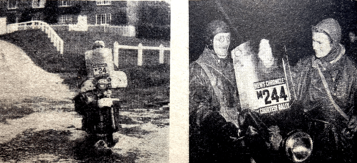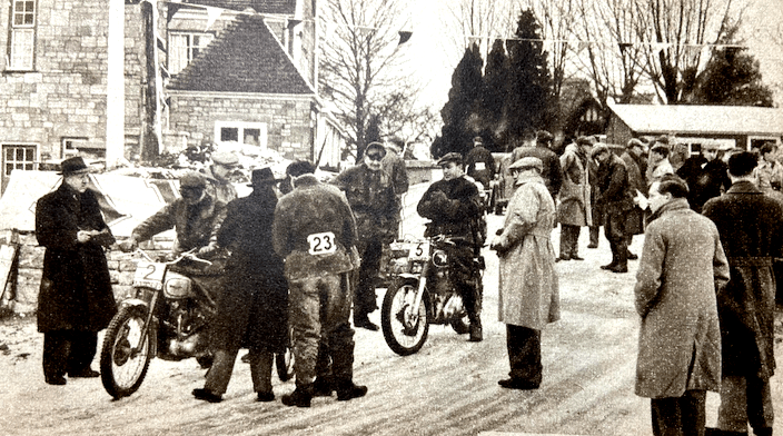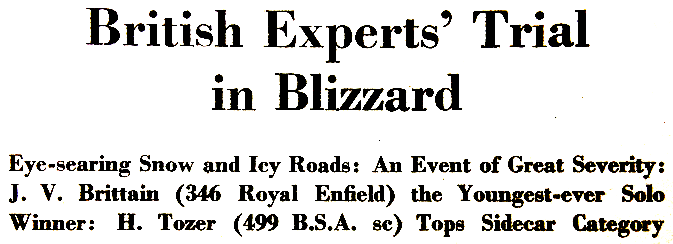 with a seized engine following damage to the oil pump. First to make a non-stop ascent was Barnes, who succeeded by footing lustily. He was spurred on by the cheering crowd, which by now numbered about 100—a surprisingly large gathering in view of the uninviting weather conditions. Other noteworthy non-stop climbs were made by Harold Tozer and RG Collier, the latter with his Norton Dominator outfit. On the second lap Collier had extremely hard luck; he negotiated the first two sub-sections without even a single dab, only to be brought to a halt in the last when his rear chain came off. Whiteway was for solos only. Divided into two sub-sections, it comprised a straight, steep ascent, followed by an even steeper climb up a narrow gully, with the inevitable rock step. On the first lap only two riders, Alves and Viney, managed unpenalised climbs. The blizzard added to the difficulties for the second lap, and it seemed unlikely that any riders would conquer Whiteway on their second attempts. However, E Usher (347 Matchless) disproved the prophets; poised on the footrests and displaying the acme of clever machine and throttle control, he was clean through both sub-sections. Shortly afterwards, AA Kirk (490 Norton) emulated Usher’s performance. By the time riders reached the notorious Stag Lane on their second circuit, this long, slimy ascent through the woods was more sticky than it had been earlier in the day. The second of three adjoining sub-sections was responsible for an appreciable loss of marks. Snow was falling thick and fast—snow which blinded the eyes and numbed the hands. With fewer than 10 miles to the finish, competitors appeared to be pressing on as quickly as they could and tackling sections as they came, rather than weighing up the difficulties beforehand. The adjoining sections of Hazel and Rowden held few terrors for the solo entry but were rather harder on the sidecar men. By way of the tight hairpin trickery of More Folly, and the special test at Ham Mill, the route wended its icy way to the finish. RESULTS Skefko Cup (best solo performance): JV Brittain (346 Royal Enfield), 27 marks lost. Palmer Trophy (best sidecar performance): H Tozer (499 BSA sc), 37. Feridax Trophy (passenger in twinning sidecar): I Wilkes.”