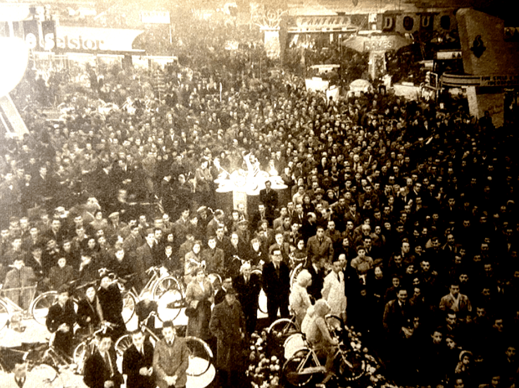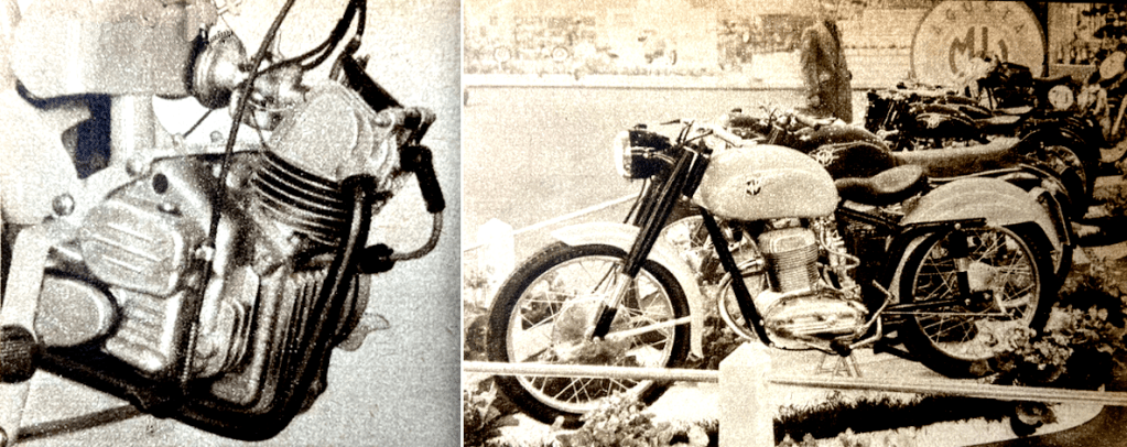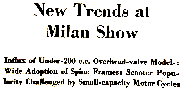 “SEVERAL CHANGES IN ITALIAN motor cycle design are manifest at the current Milan Show. The 30th in the series, the Esposizione Internationale opened last Saturday in the modernistic, fan-shape Pavilion of Engineering, one of the buildings on the site of the World’s Fair held in Milan last April. The first and most striking development is the incursion of the ohv four-stroke engine into the light-weight two-stroke sphere. Another proclivity, one which may, at this stage, be more of an indication than a definite trend, is that, according to some manufacturers, the colossal boom in the scooter sphere is lessening, and public interest is turning more and more toward lightweight motor cycles. A third portent is the almost universal adoption of all-welded frames with pivoted-fork rear springing; a fourth is the wide adoption of the AC generator; yet a fifth is the increasing popularity of the ‘spine’ frame. Public interest in powered two-wheelers in Italy continues at a higher level, probably, than in any other nation. The total number of machines registered in the country at October 31 last was over a million and a quarter. The exact figure is 1,318,500, which represents an increase of roughly 260,000 over the corresponding figure of a year ago. During the past 10 months, it is held, registrations have increased at the rate of 1,100 a day. This rise applies to all classes of powered two-wheelers. Scooters and lightweight motor