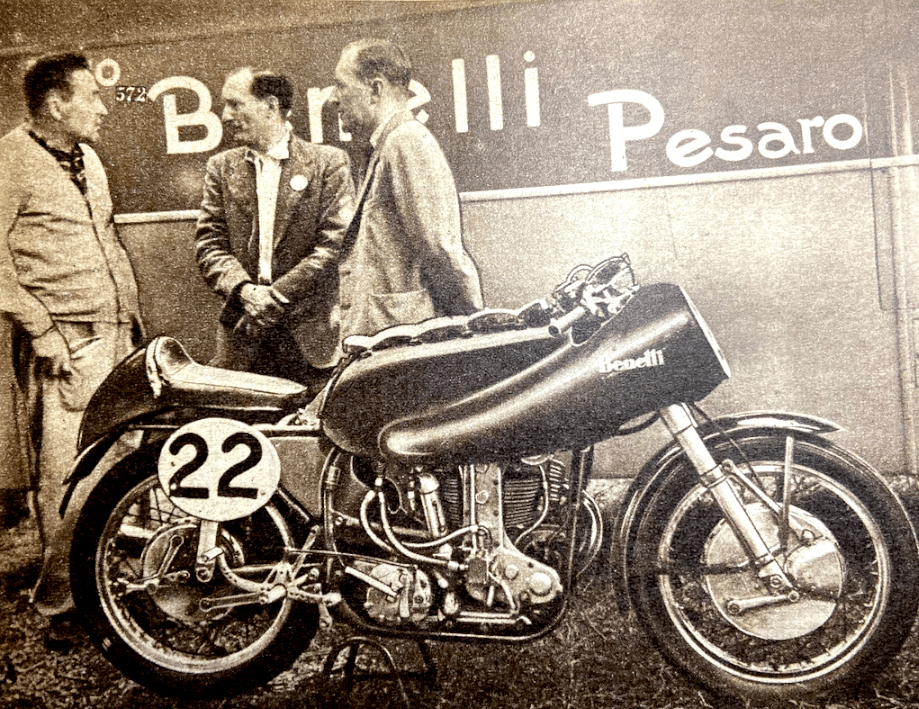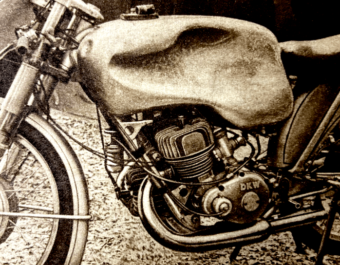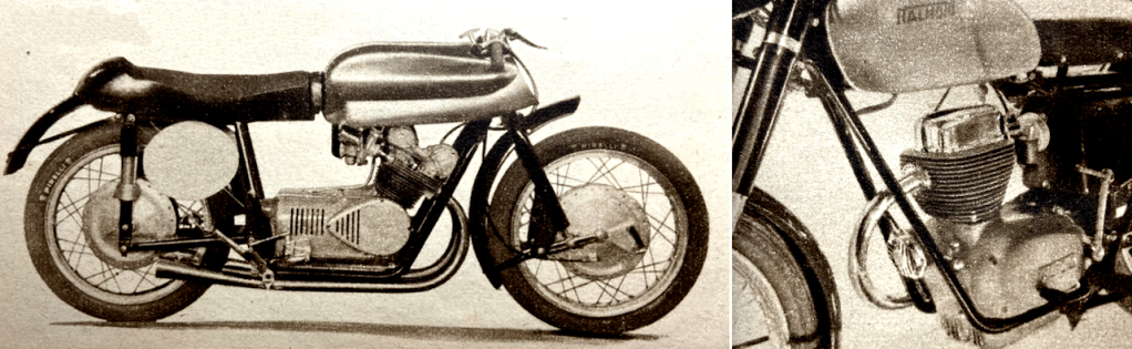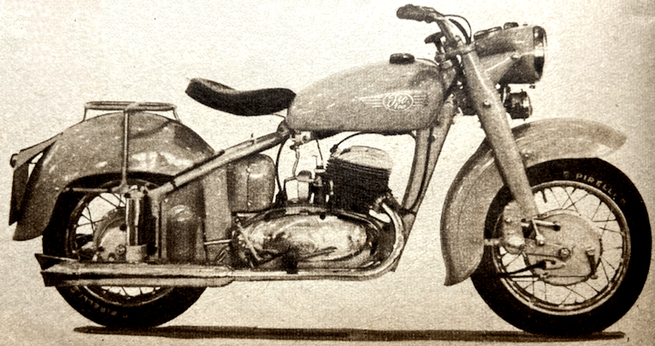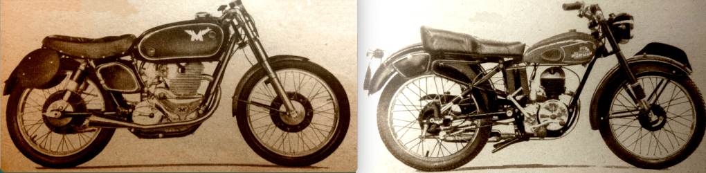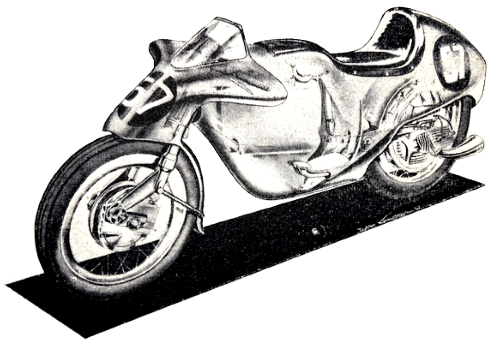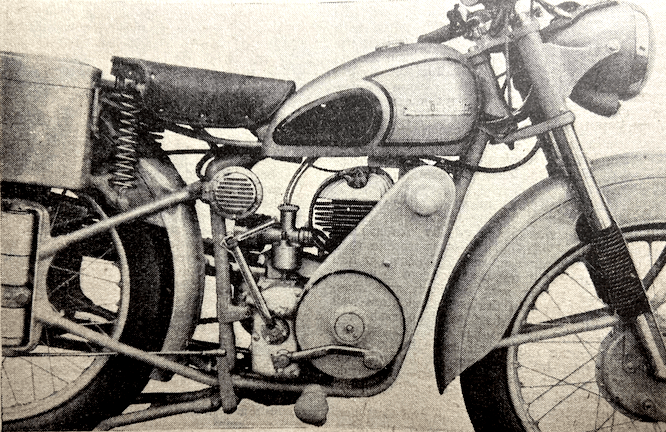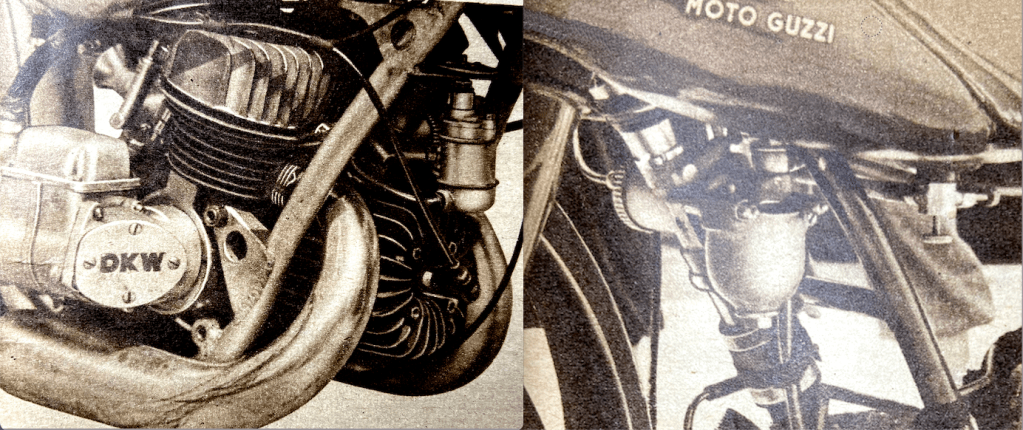 “ONE OF THE MOST stimulating designs of the present day is without doubt the Italian 125cc twin-cylinder two-stroke Rumi. I have just had an enthusiastic letter from Thierry Holst, the well-known Dutch journalist, who has had a peep inside a Rumi engine and an opportunity of trying one of the sports models. One of the things I did not know is that the pistons have deflectors which are V-shape in plan. The cylinder heads have female equivalents of the deflectors, so that good gas turbulence ‘up top’ results. Indeed, according to Thierry, the deflectors have proved so efficient that a reduction in ignition advance has been possible. Before adoption of the deflectors, the ignition advance at 6,500rpm required to be in the region of 29°; with the deflectors, only 22° advance is necessary at 8,200rpm. The compression ratio of the sports model engine is 11½ to 1 (!) for use with normal ‘super’ (78-octane) fuel. The crankshaft is of the three-bearing type, with one bearing in the middle between the big-ends. The circular internal flywheel is highly polished. Holst’s letter goes on, ‘I don’t know if you have ridden a Rumi, but if not, let me tell you it’s a marvel. I rode the sports bus (not the racer), which behaves like a good ohv 350 and has a maximum of over 70mph (not kph—miles!). The suspension proved amazingly good. Braking is positive, progressive and safe. The riding position is like that of a comfortable 500. Acceleration is completely breathtaking. In spite of the high performance, fuel consumption tops 112mpg at 40mph.’ Thierry’s letter runs to nine pages. He does not stint himself in the use of superlatives, and he eulogises the Rumi as I have never known him praise a motor cycle before. Other snippets of interest from the letter are that Rumis have a 125cc ohc four-stroke for attacking Mondial road-racing supremacy. The 250cc ohc parallel-twin racer, which has the camshaft driven by gears between the cylinders, is undergoing tests at Monza. The 125cc racer, says Thierry, has not yet run. For a firm that is also engaged in the manufacture of textile machinery, and which made torpedoes during the war, Rumis have certainly made vast strides in the motor cycle world. He who first condemned the Latins as a lazy people certainly overlooked the Italian-motor cycle manufacturers!”—Nitor