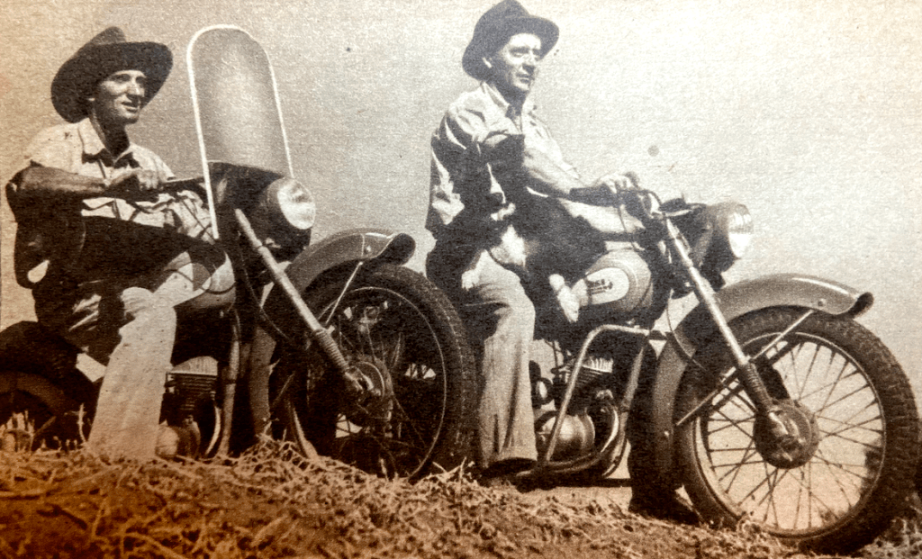 “FOR A HUNDRED YEARS the Australian jackeroo (boundary rider)—that great legend of the outbacks—has relied on horses to do his work. Today it is no longer fashionable, or economical, for that matter, to use a horse, and for boundary riding and sheep droving he uses a motor cycle. This was revealed recently by AE Smith, of Menincourt Station, Pooncaris, New South Wales, in an essay competition which won him a BSA Bantam. He said that the Australian station owner now found that a motor cycle, especially a spring-frame model, will go anywhere and, more quickly and cheaply, do work which previously could only be done by the horse. The 125cc two-stroke, because of its lightness and dependability, is considered ideal for this work. Mr Smith said he uses eight BSA Bantams which have almost replaced horses on his station (ranch). Several stations in the surrounding district also have two-stroke motor cycles doing daily work—for transporting stockmen on long trips across the property, for journeys into town centres for provisions, and generally for all the work formerly executed on horseback. The machines travel up to 20 miles, over all types of country, in under the hour. ‘The horse would take a whole day to complete the same journey,’ said Mr Smith. For rounding up stock a box is generally fitted to the carrier, and a sheepdog, the famous Australian ‘kelpie’ (said to be a cross between a collie and the native ‘dingo’—wild dog), rides pillion. The beauty is that the dog arrives at the destination fresh to start on its energetic work of rounding up the stock. At first, the dogs were a bit shy of motor cycles, but one ride was sufficient to convince them. ‘You only have to walk up to a machine and the dog will leap into the box ready to be taken for a ride,’ said Mr. Smith.”