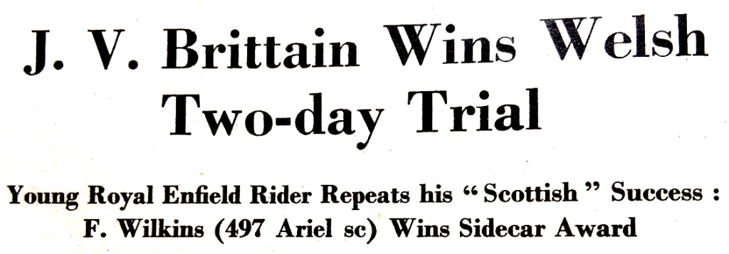 “RUN OVER A super-sporting, mountain course in some of the most rugged and beautiful areas of ‘wild Wales’ last weekend, the national Welsh Two-day Trial drew a record entry of 113 (last year’s entry totalled 78). On the first anniversary of the event, therefore, the organisers, the Mid-Wales Centre, had the satisfaction of knowing that the popularity of their highly-specialised event is increasing and that their enterprise in inaugurating it has been well justified. Fresh from his victory in the Scottish Six Days’ Trial, JV Brittain, riding his 346cc Royal Enfield, remained on top of his form to win the event by a clear-cut margin; he lost only four marks on observation and none on time. His nearest rivals were DS Tye (348 BSA) and PJ Mellers (497 Ariel), each of whom lost nine marks on observation and won the 350 and 500cc cups respectively. Best performance among the sidecar entry of six was made by F Wilkins (497cc Ariel sc) with 31 marks lost. As might be expected, with the trial based in Llandrindod Wells, good humour ran high and there was an air of joie de vivre among riders, officials, and spectators alike. With almost as much depending on the maintenance of tight time schedules over the rough stretches of the course (which meant over most of it!) as on performance on observed hills, there was also, about the event, a trace of ISDT atmosphere. Many riders carried spare inner-tubes and large inflators and many were using rear-sprung twins. A highlight of the event was that WJ Stocker was in charge of a thrilling new 700cc Royal Enfield vertical twin, which was equipped to semi ‘International’ specification. Under a warm, early-morning sun, which beamed out of a clear blue sky, the chairman of the Llandrindod council, councillor WH Edwards, JP, started the first competitor on the 135-mile route for the first day, Friday. Before reaching the first observed section, Fellwyd, some 50 miles, embracing three time checks, had to be covered. Very little