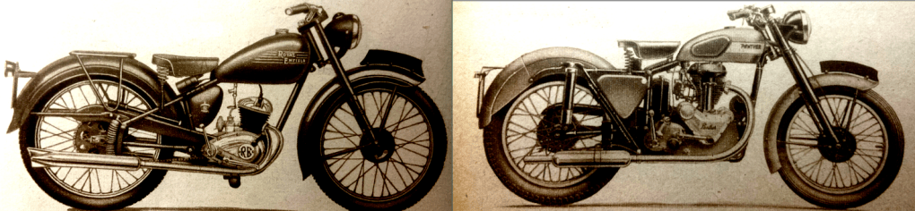 “SELF PRAISE IS no recommendation, as the old adage puts it. But those of us who are outside ‘the trade’ have every right to feel proud of our country as we tread the interminable concrete gangways at Earls Court. War-battered and impoverished, largely stripped of our Empire and stung by the ingratitude of many backward nations to whom we have been reasonably wise and kind foster-parents, we can still produce a range of motor cycles unparalleled In the world. The designers, who deserve the major credit, are all there to witness their personal triumphs. I could wish that every factory hand, from the office boys and cleaners upward, could visit the great hall, and realise the majesty of the enterprise in which they have played their part. For quality, originality and tastefulness the exhibits are more impressive than ever. Other nations annually contrive to evolve and construct one or two models which achieve a world market, figure notably in international races, and serve their own populations faithfully. But after all these years Britain still contrives to turn out quite a squad of models which leap across the barriers of tariffs and of patriotic prejudices, and Britain still possesses the acumen to blaze new pathways of evolution. I am proud to be a Briton, just as in a different sphere an even deeper pride suffused me on VE Day and VJ Day.”—Ixion